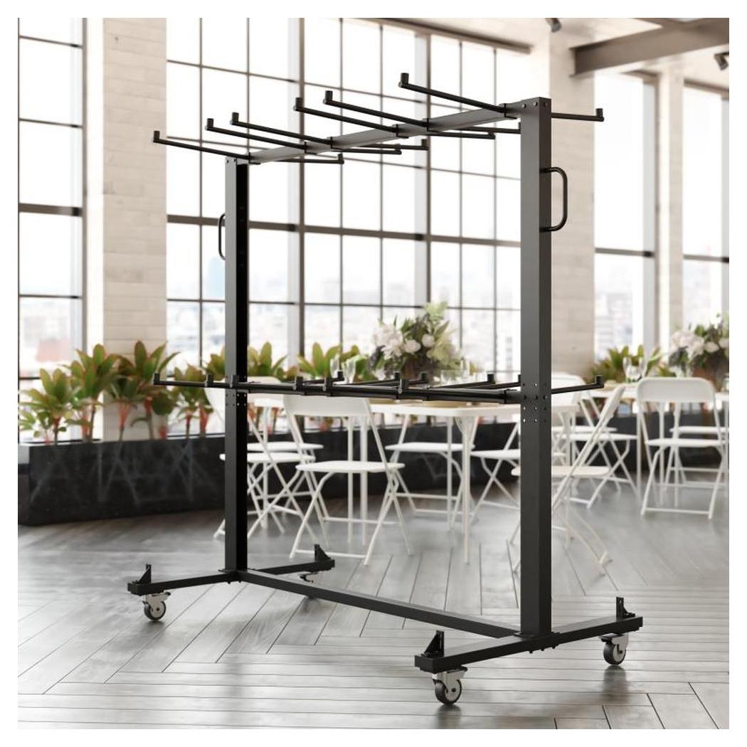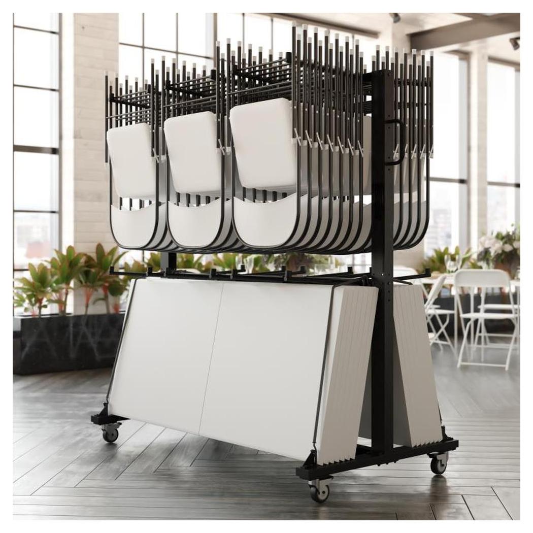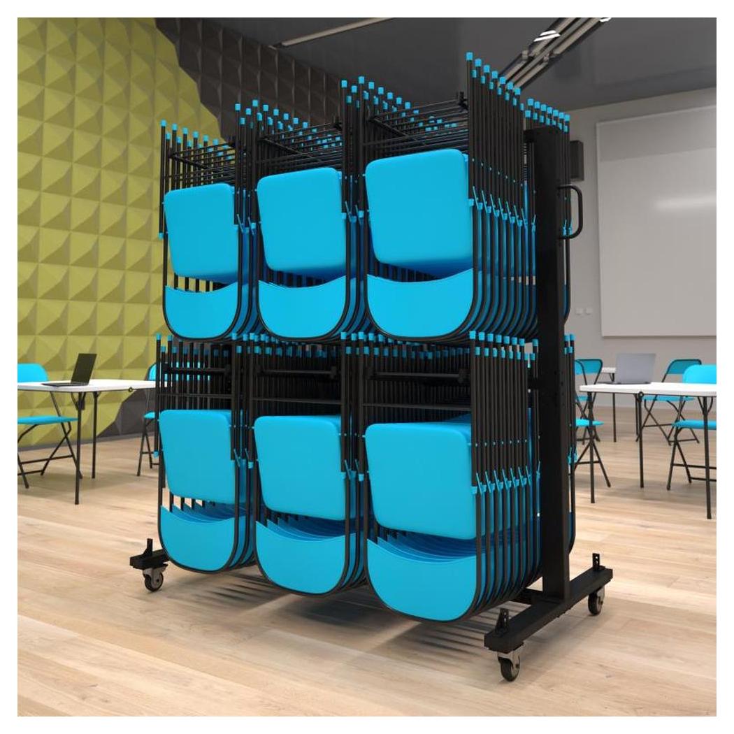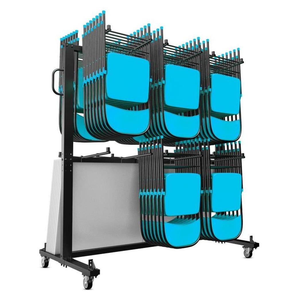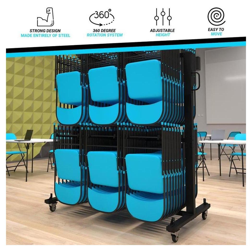 Información adicional: Dimensiones: 181,6 cm de ancho, 85,1 cm de profundidad, 186,7 cm de altura, Capacidad de carga estática de 299,37 kg, puede alojar hasta 84 sillas o 42 sillas y 12 mesas según el tipo de silla, Cuatro ruedas están incluidas para una maniobrabilidad óptima,