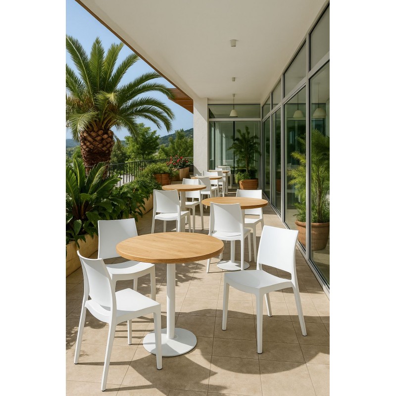 Diseñada para un uso versátil, esta silla es adecuada tanto para entornos interiores como exteriores. Se adapta a terrazas de cafeterías, salas de reuniones, espacios para eventos o zonas de descanso. Su capacidad de apilamiento facilita el almacenamiento y la optimización de espacios. Ideal para profesionales que buscan muebles prácticos y duraderos.