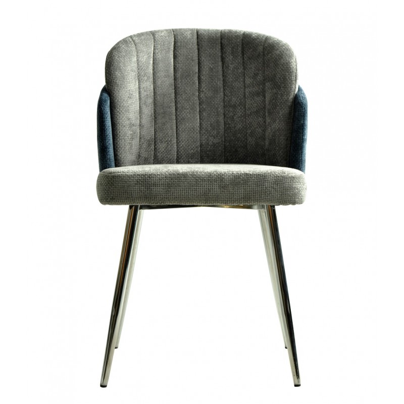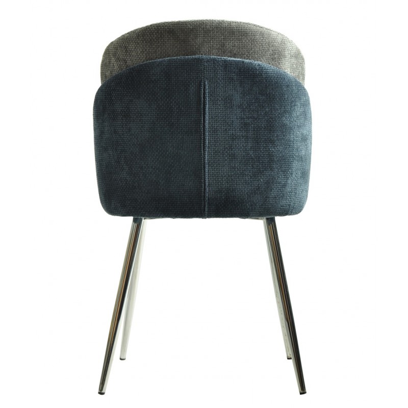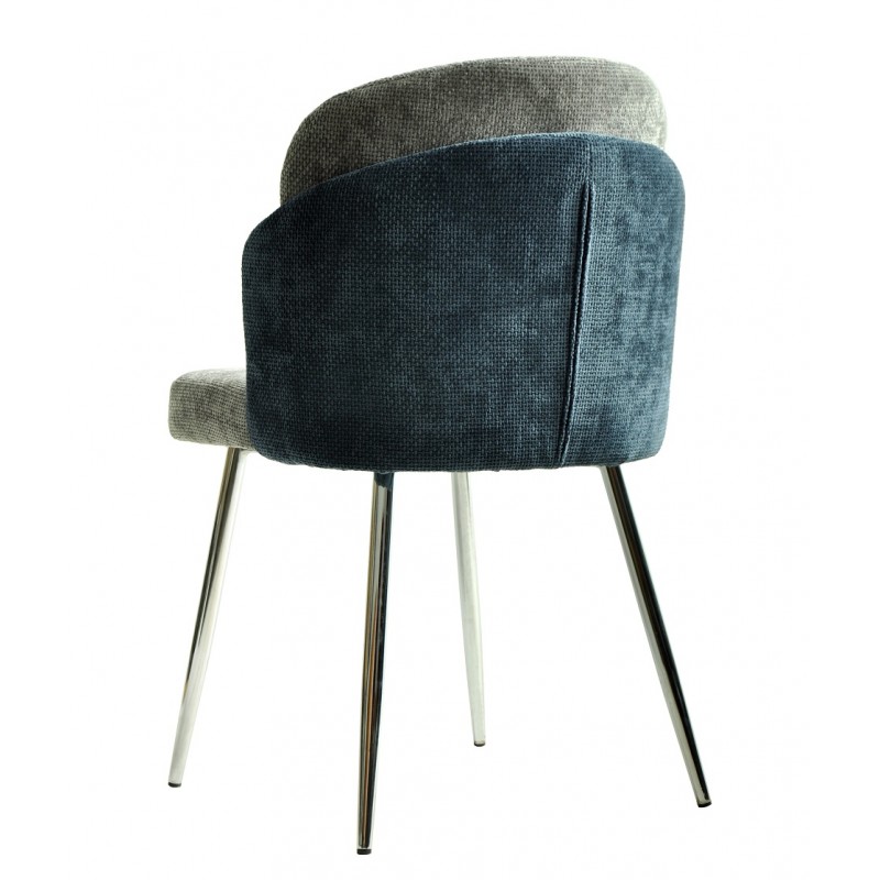 La base cromada aporta robustez y estabilidad, garantizando un aspecto contemporáneo. El asiento y respaldo están revestidos de tela chenilla, combinando azul y gris claro para un acabado suave y elegante. Los materiales seleccionados garantizan una buena resistencia al uso diario.