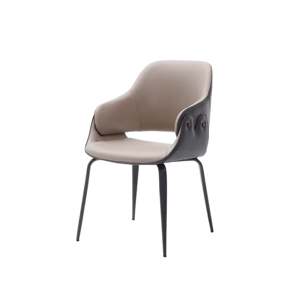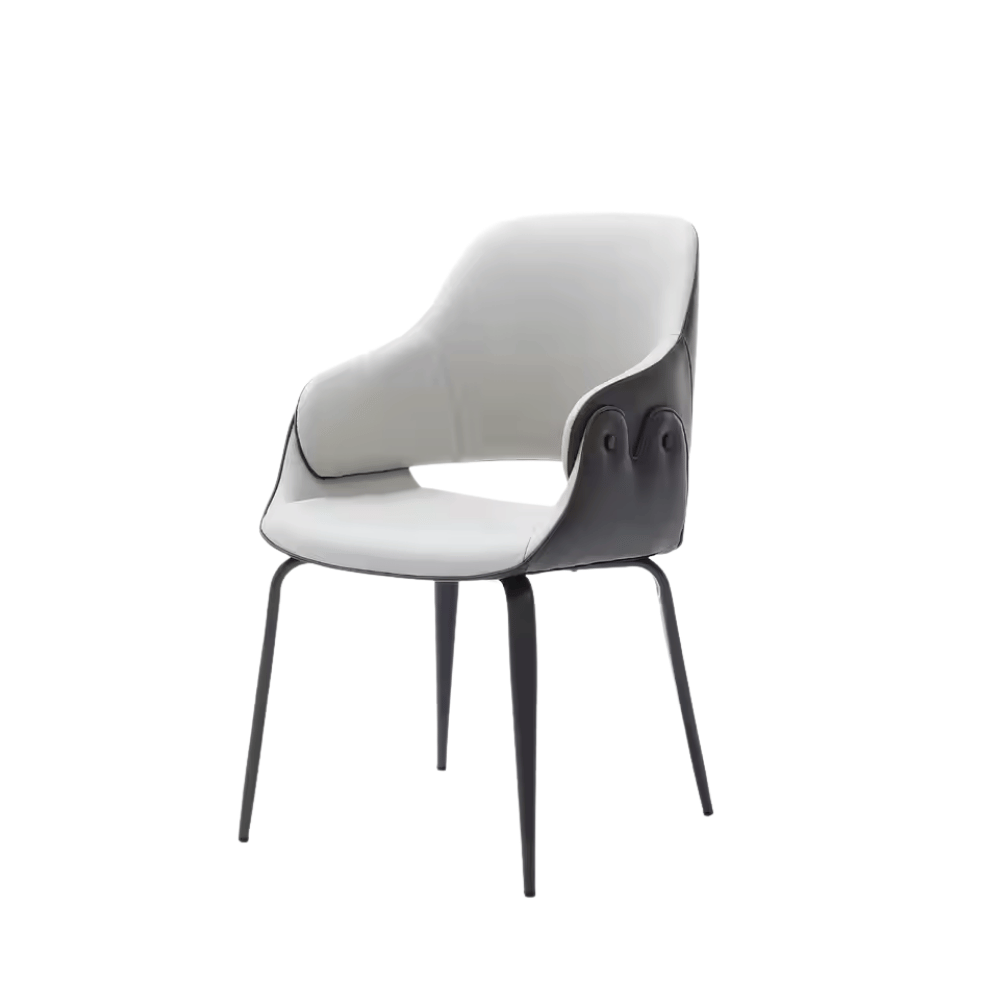La estructura de la silla es de madera de fresno pulida, ofreciendo una notable estabilidad. Su acolchado de espuma de poliuretano de alta densidad asegura un soporte duradero, incluso después de largas horas de uso. El asiento está cubierto de cuero sintético, combinando estética y facilidad de mantenimiento.