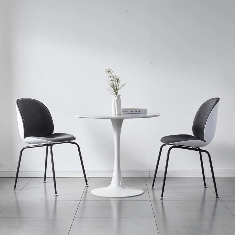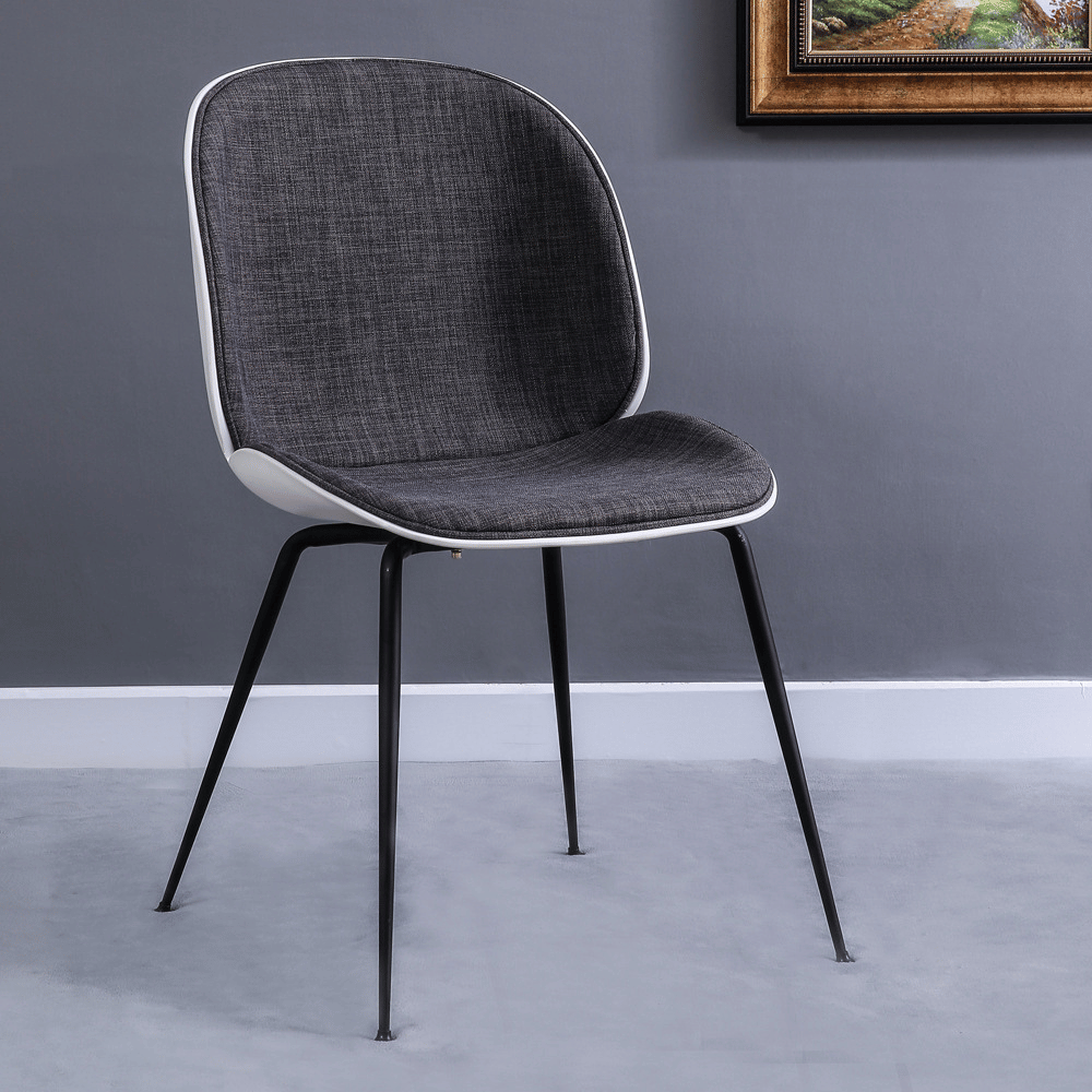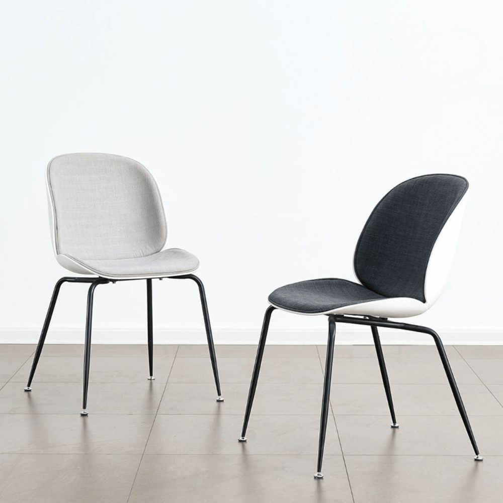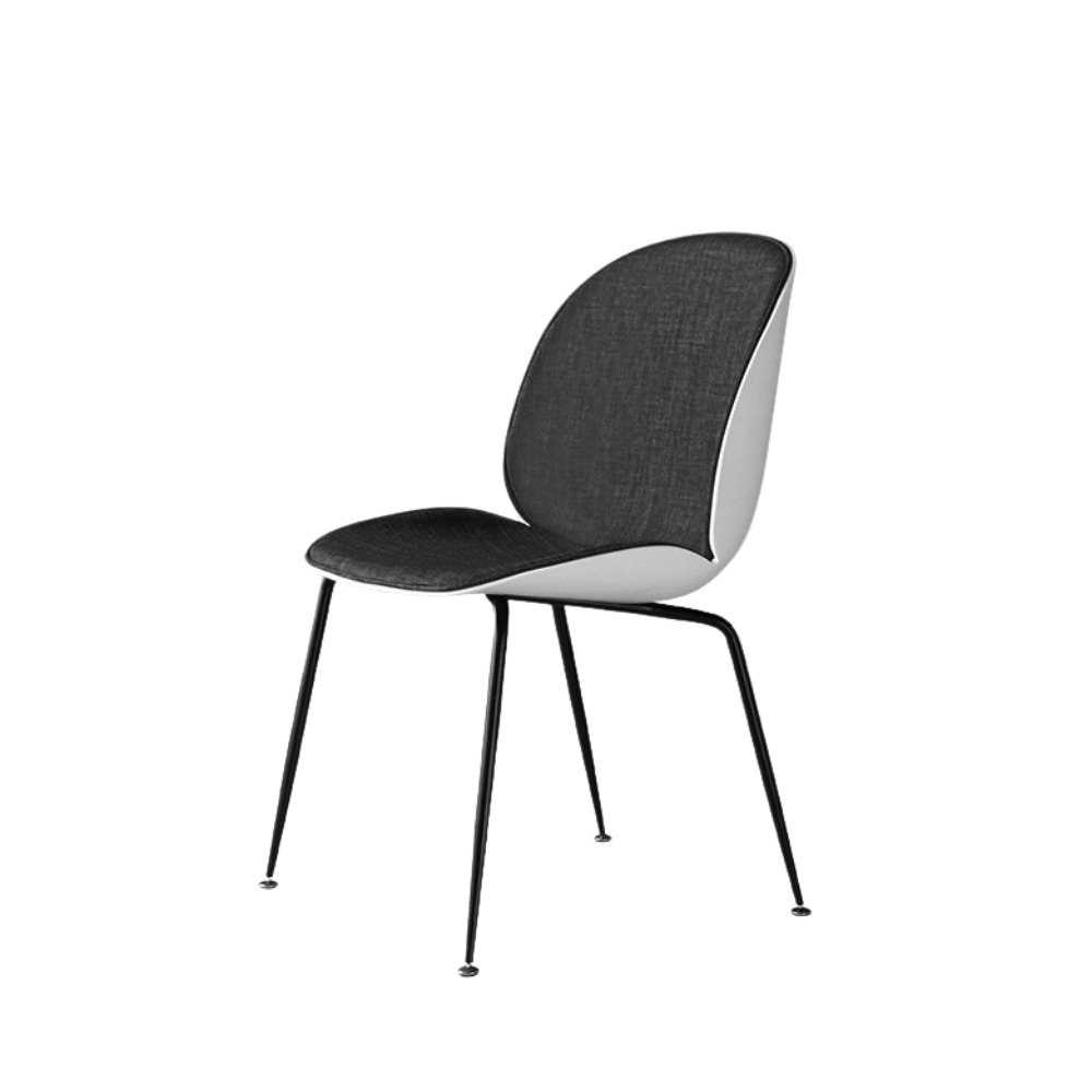 La estructura de la silla está hecha de polipropileno reforzado con fibras de vidrio, garantizando estabilidad y durabilidad a largo plazo. El cojín de tela aporta un toque adicional de comodidad, mientras que la base de metal pintado asegura un asiento sólido.