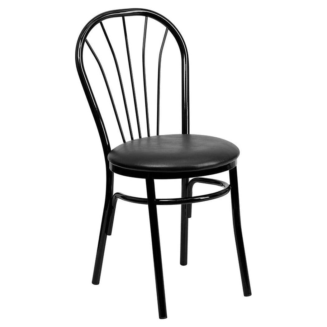 Esta silla de metal con respaldo de abanico está diseñada para ofrecer comodidad óptima en espacios de restauración,