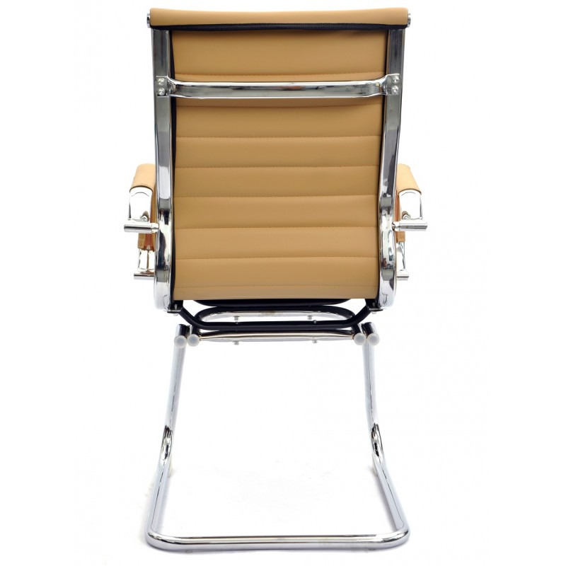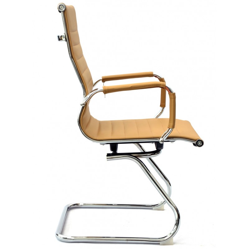 El similcuero marrón claro tiene un acabado cuidado y uniforme, reforzando el aspecto profesional de la silla. La estructura cromada cuenta con tratamiento anticorrosión que conserva su brillo con el tiempo. Cada detalle, desde los apoyabrazos hasta las costuras del respaldo, contribuye a una alta percepción de calidad y durabilidad prolongada.