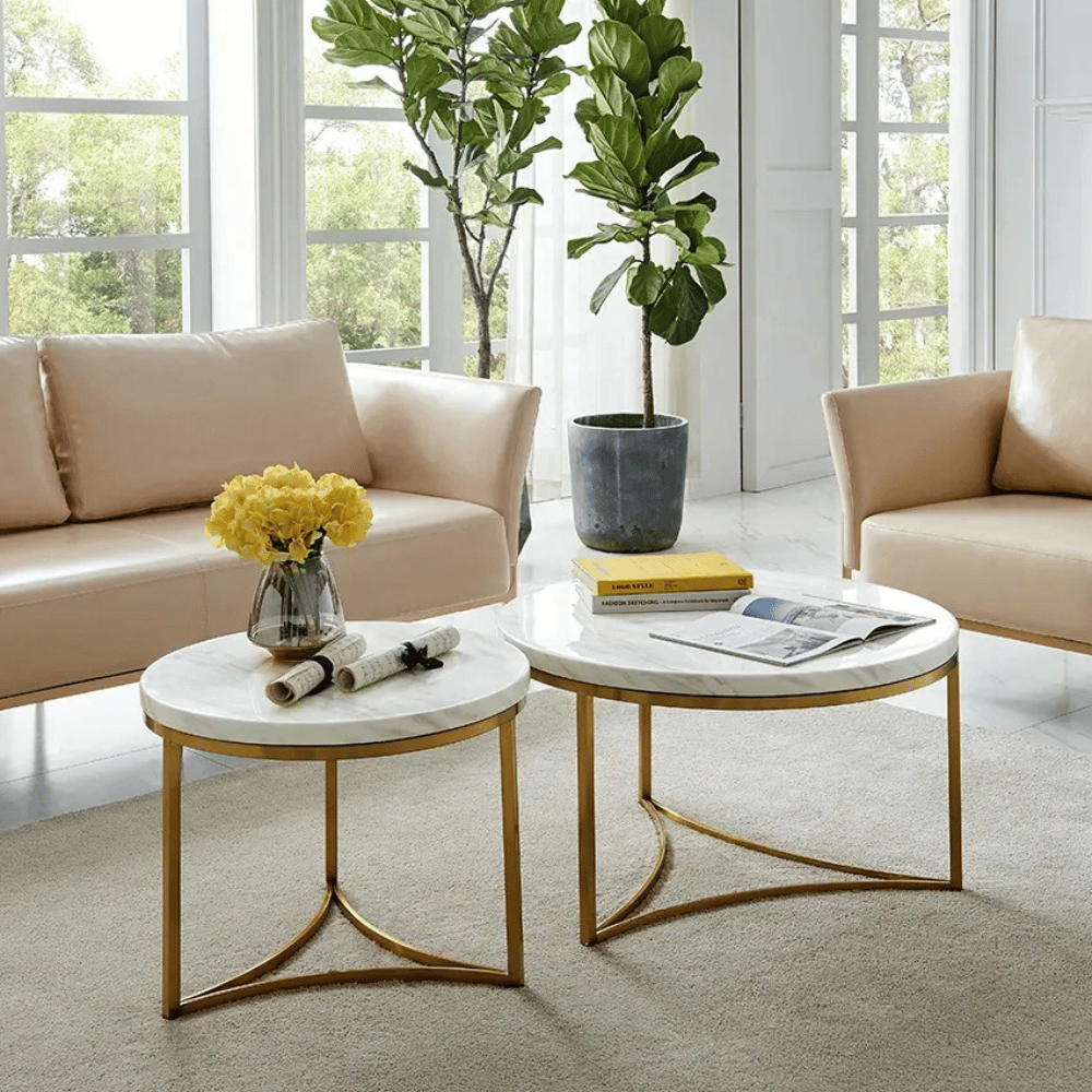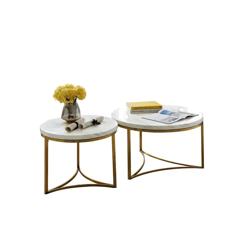 **Conjunto de mesas auxiliares redondas Skovde con tapa de mármol – acabado de lujo**