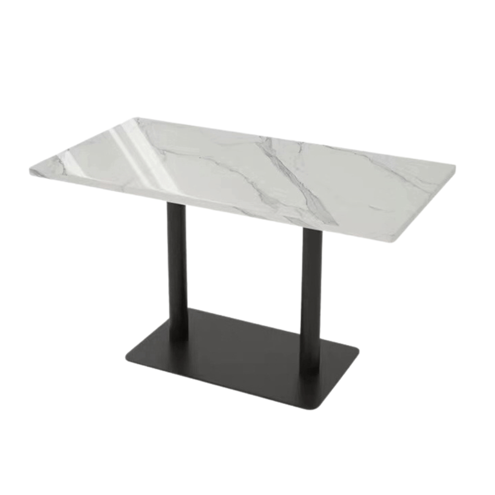 La mesa cuenta con una base de acero negro lacado, que garantiza resistencia y estabilidad. Su tablero de piedra sinterizada, disponible en negro o blanco, es elegante y fácil de mantener. Los bordes redondeados del tablero añaden un toque de suavidad al diseño.