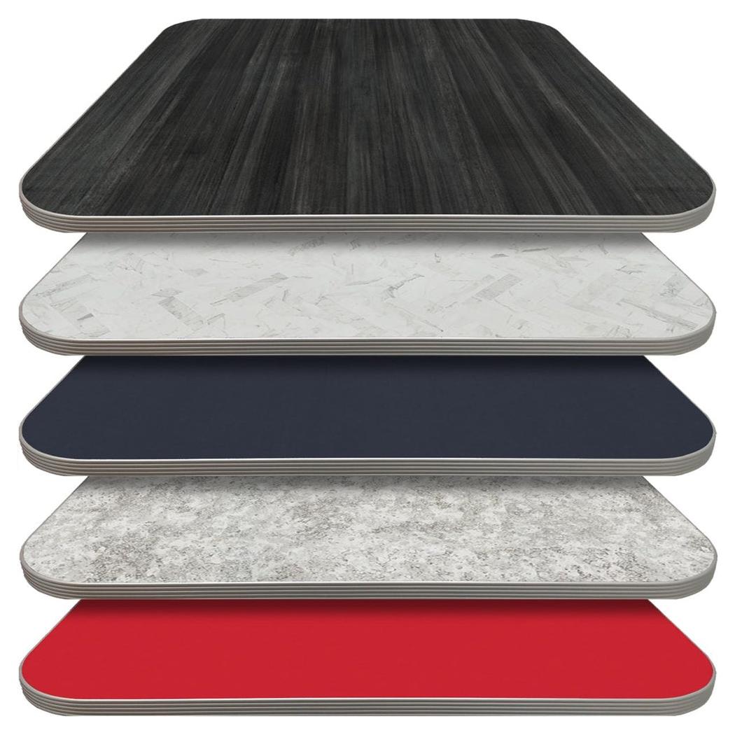 Información adicional: Dimensiones de 1,25 pulgadas de grosor, peso de 20,41 kg, Opciones de laminado disponibles en Formica y Wilsonart, así como varios colores para el borde de goma, Las mesas de más de 48 pulgadas pueden incurrir en cargos adicionales de envío,
