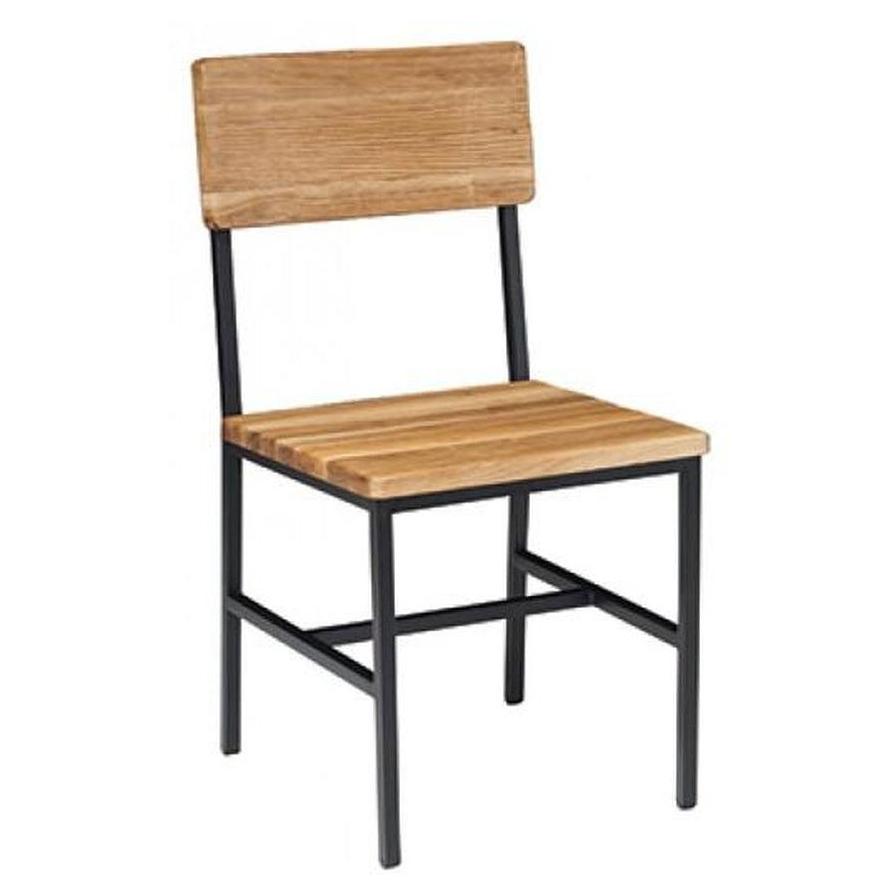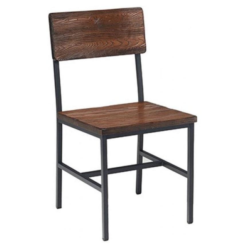 Información adicional: Dimensiones de 86,4 cm de altura, 50,8 cm de profundidad y 45,7 cm de ancho, con una altura de asiento de 45,7 cm, Disponible en madera recuperada (nogal, natural) o con opciones de tapizado en vinilo o tela, Pedido mínimo de 12 unidades,