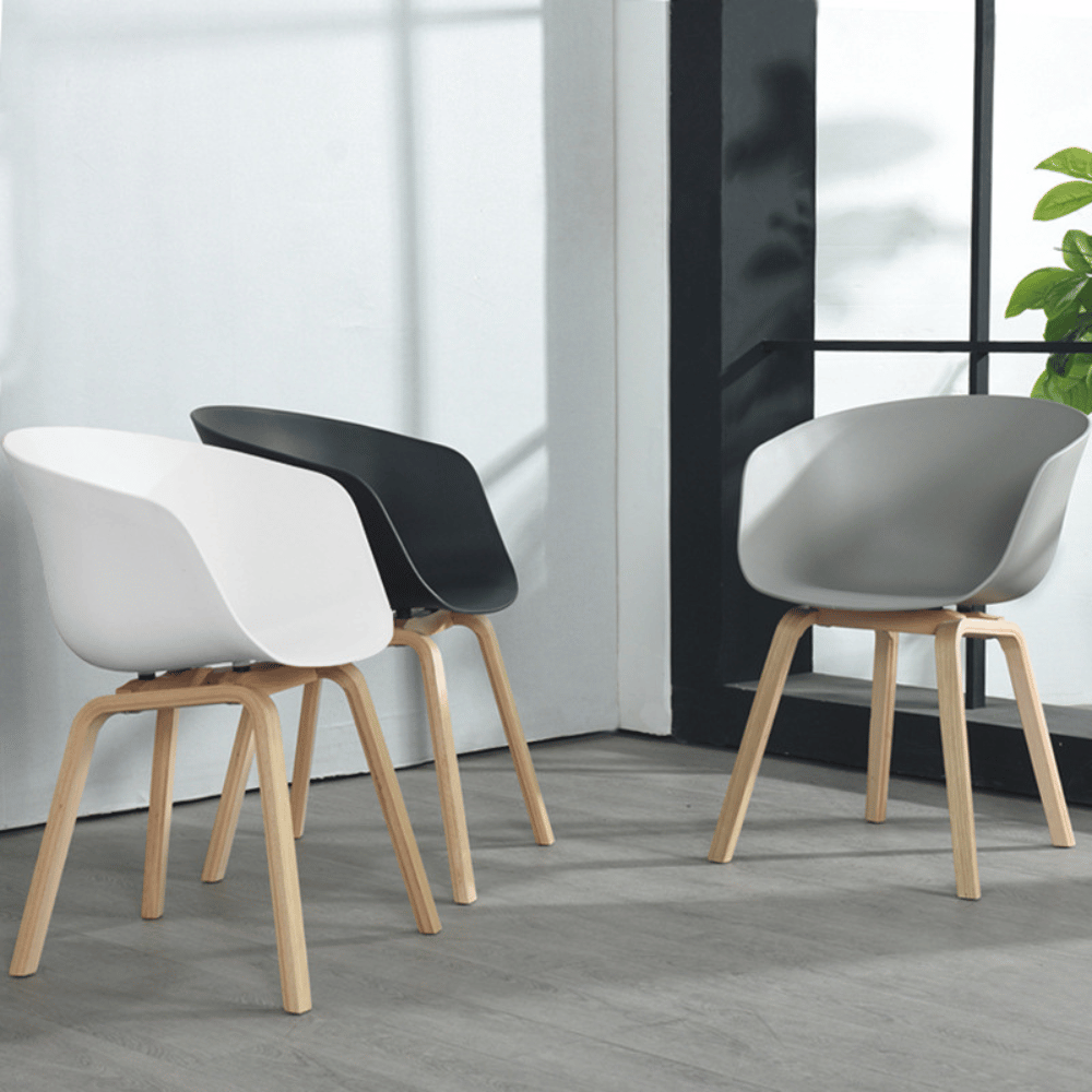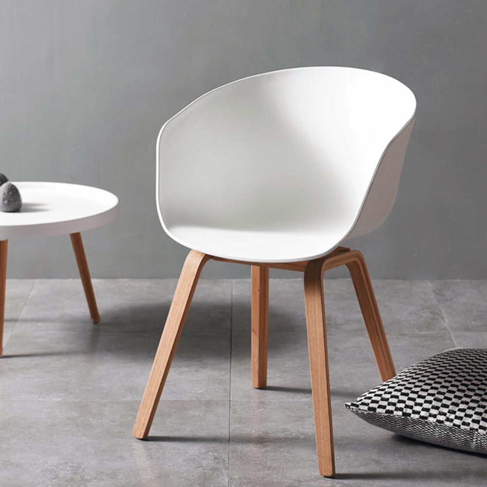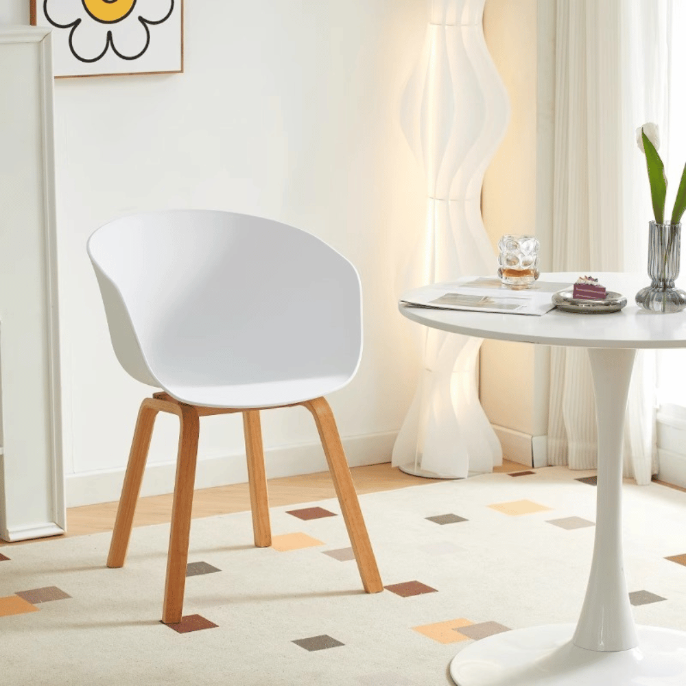 La silla está fabricada en plástico moldeado de alta calidad, reforzado con fibras de vidrio, garantizando una estructura estable y duradera. Su base de madera de fresno pintada asegura solidez y aporta un toque cálido al conjunto.