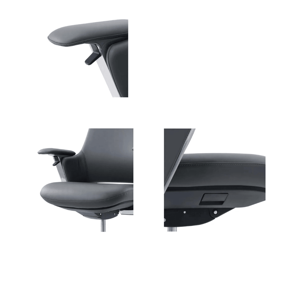 El sillón está tapizado en cuero genuino de alta calidad, importado de Brasil, garantizando una estética cuidada y un tacto agradable. Su estructura está reforzada por un marco de aleación de aluminio, ofreciendo robustez y ligereza. El respaldo está compuesto por un panel curvado de doble capa, diseñado para adaptarse a la forma de la espalda.
