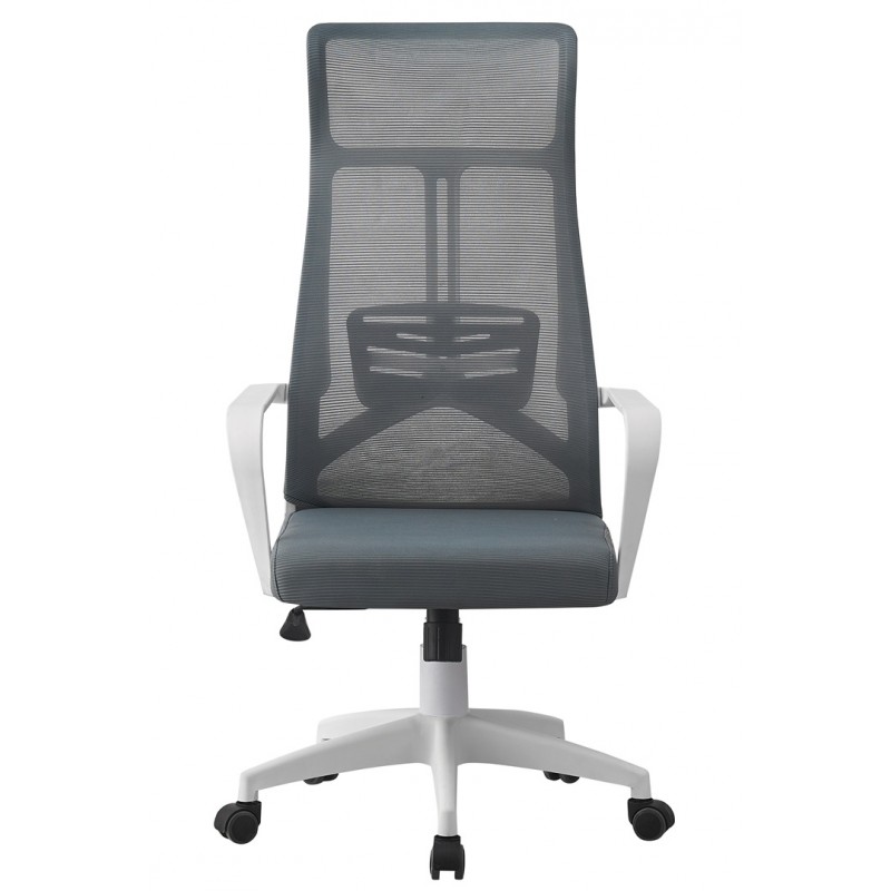 La estructura se basa en un marco de nylon, reconocido por su robustez y ligereza, con un acabado blanco que aporta modernidad y luminosidad al conjunto. El respaldo alto incluye un reposacabezas, garantizando mayor comodidad a nivel cervical. El asiento y el respaldo combinan materiales técnicos: un tejido gris para el asiento y una malla translúcida para el respaldo, favoreciendo la transpirabilidad y la frescura.