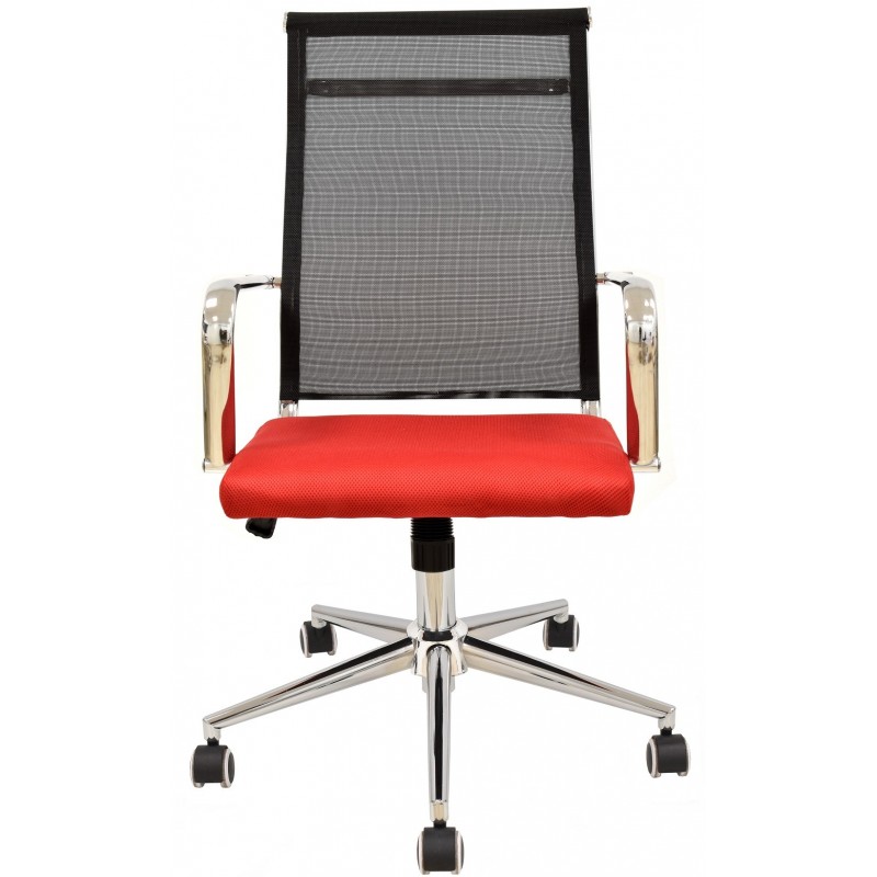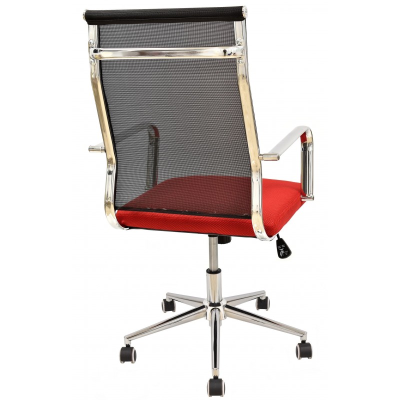 La estructura descansa sobre una base de acero cromado, garantizando robustez y estabilidad. El respaldo está diseñado en malla negra, un material transpirable que optimiza la ventilación de la espalda. El asiento, cubierto con tela roja, está acolchado para ofrecer un soporte cómodo. Los apoyabrazos, también cromados, refuerzan el aspecto de calidad y durabilidad del sillón.
