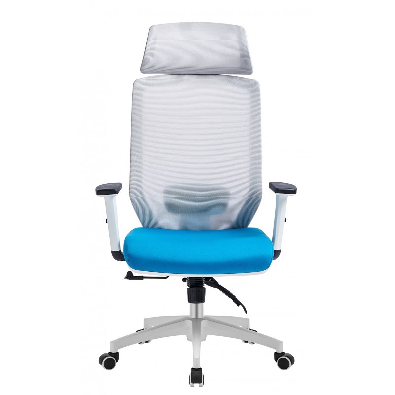 La estructura se basa en un marco y una base de polipropileno blanco reforzado con fibras de vidrio, garantizando robustez y ligereza. El asiento combina una tela acrílica azul claro, agradable al tacto, con un respaldo de malla gris con un patrón horizontal, ofreciendo una excelente ventilación. El mecanismo sincronizado y el pistón de gas aseguran una adaptación fluida de la altura y la inclinación. Los reposabrazos ajustables en altura brindan un soporte adicional, personalizable según las necesidades.