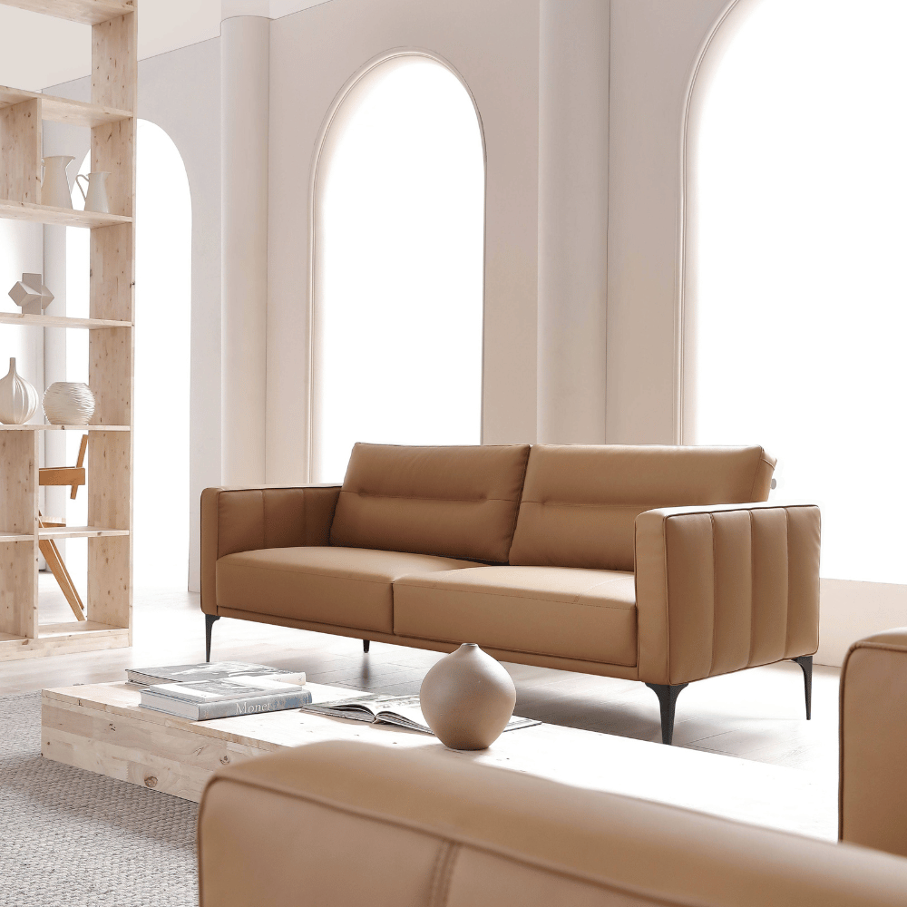 El Kuwait cuenta con un revestimiento de cuero de calidad que garantiza una estética cuidada y duradera. Su estructura de madera maciza asegura una robustez excepcional, mientras que la espuma de alta elasticidad brinda un soporte agradable. La base de acero negro añade un toque moderno y asegura la estabilidad del conjunto.