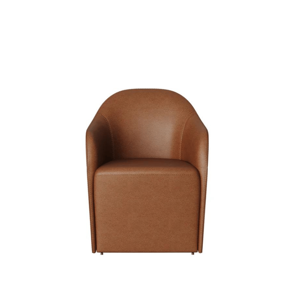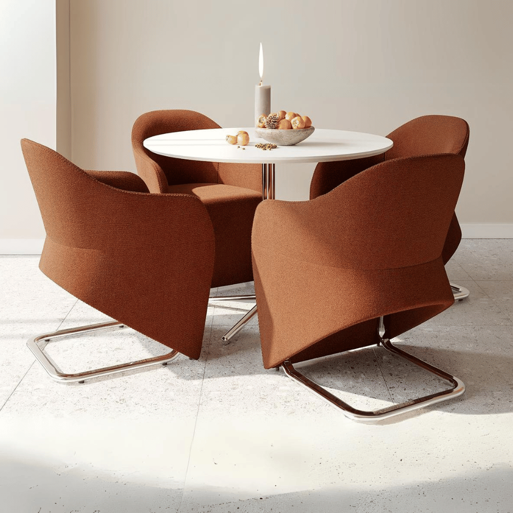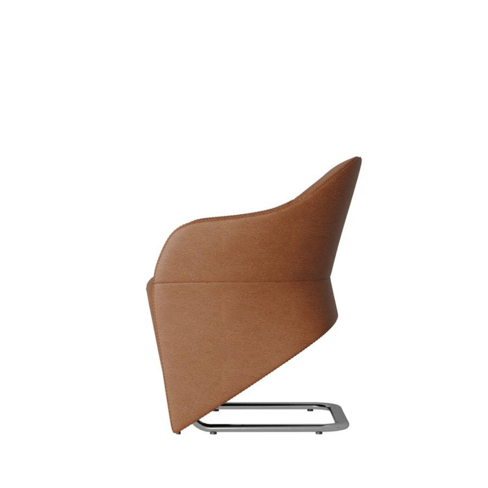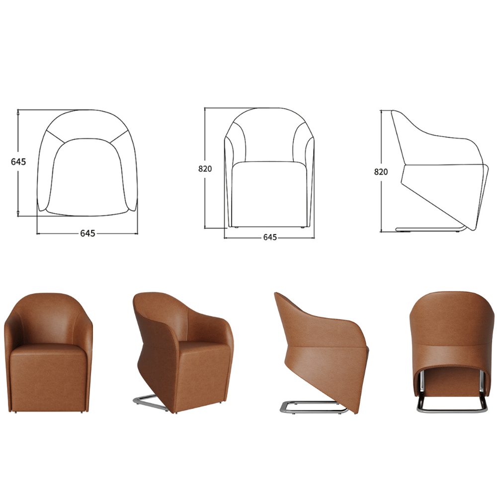 El sillón está diseñado con un revestimiento de cuero sintético de calidad, que ofrece una agradable sensación al tacto. Su base de metal en forma de U garantiza una estabilidad óptima al tiempo que añade un toque escultural al conjunto. El diseño de curvas y ángulos está pensado para combinar comodidad y estética.
