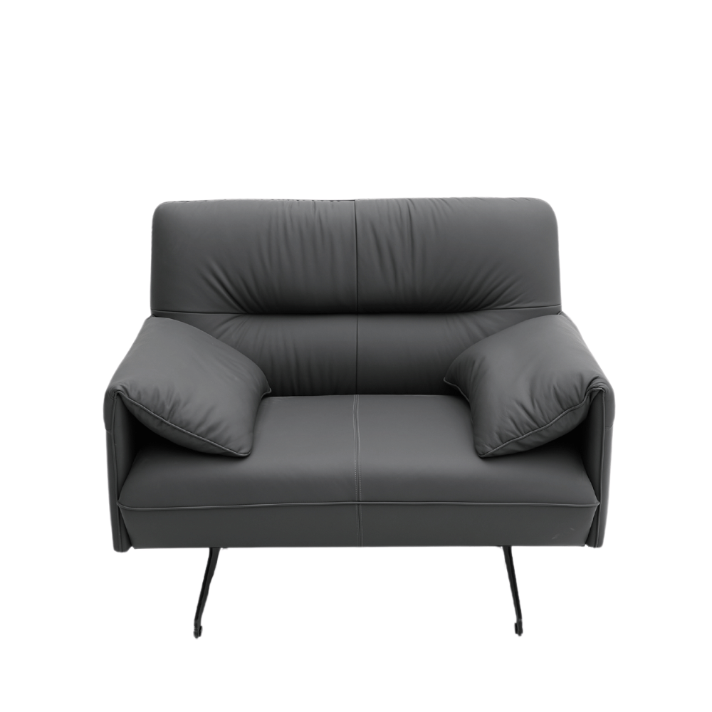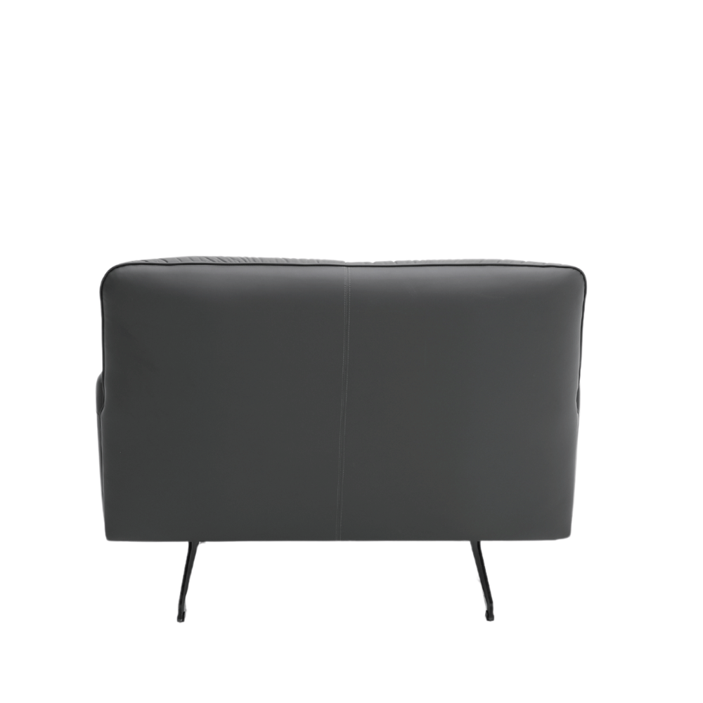 Su estructura interna está hecha de madera de alerce importada, garantizando estabilidad y durabilidad a lo largo del tiempo. El relleno de espuma de poliuretano moldeada ofrece un confort óptimo sin deformaciones. El exterior está revestido de cuero de alta calidad, asegurando un acabado cuidado y agradable al tacto. Las patas de aluminio pintado añaden un toque contemporáneo al conjunto.