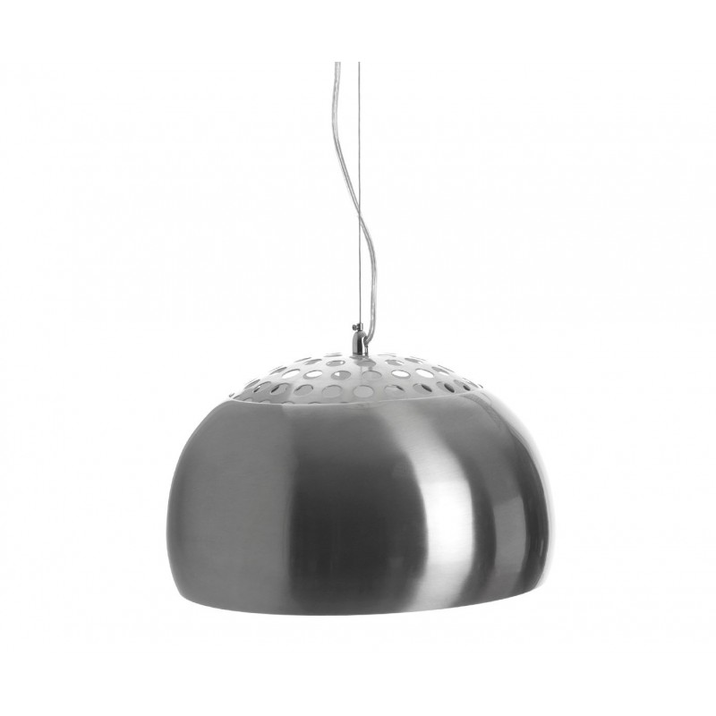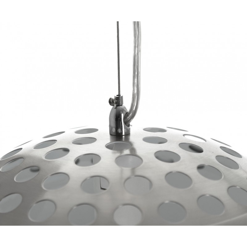 La lámpara colgante cuenta con una pantalla de metal cromado satinado, con un diámetro de 32 centímetros, que difunde la luz de manera uniforme y limita los reflejos. Su cable permite ajustar la altura hasta 150 centímetros, ofreciendo una gran flexibilidad de instalación según las necesidades específicas del lugar.
