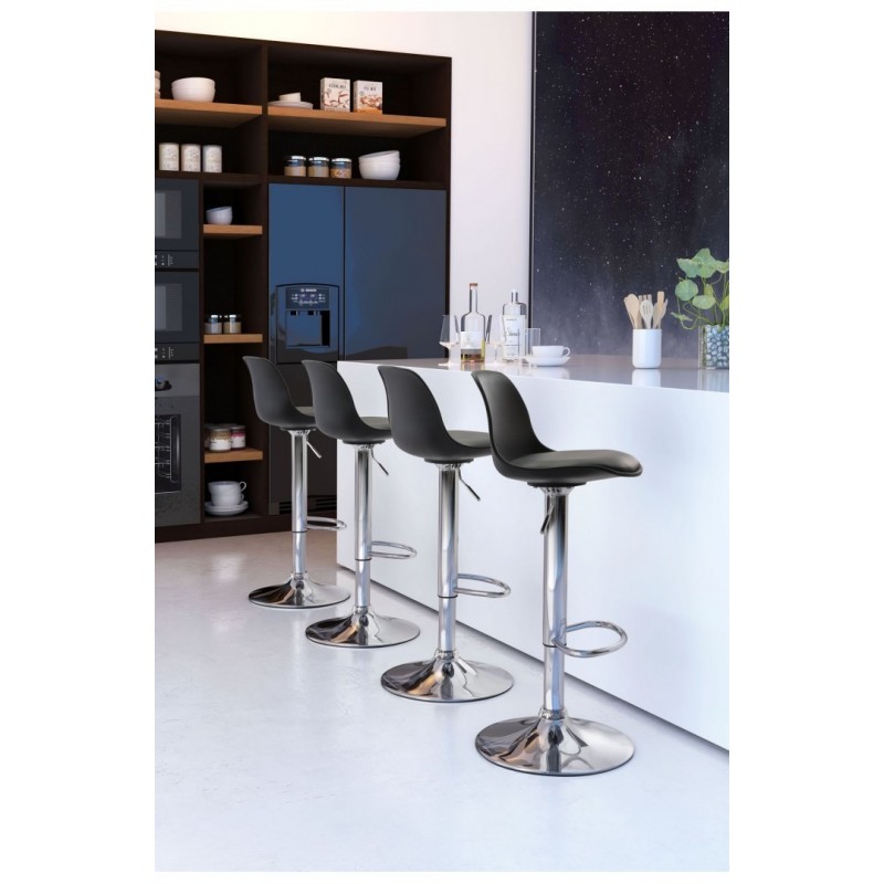 La estructura se basa en una columna robusta con reposapiés integrado, todo ello revestido con una base cromada que garantiza estabilidad y elegancia. El asiento combina polipropileno inyectado negro, conocido por su resistencia y ligereza, con un cojín de cuero sintético negro que proporciona comodidad adicional. El sistema de ajuste mediante pistón de gas garantiza una adaptación rápida y sencilla a la altura deseada.