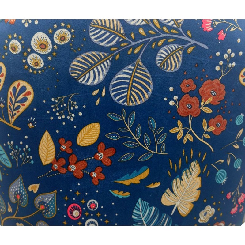 La estructura de metal garantiza solidez y estabilidad, mientras que el revestimiento de terciopelo azul del asiento ofrece una comodidad agradable. El respaldo presenta un motivo de palmera que aporta una nota original y refinada. Esta combinación de materiales garantiza una buena resistencia al uso diario.