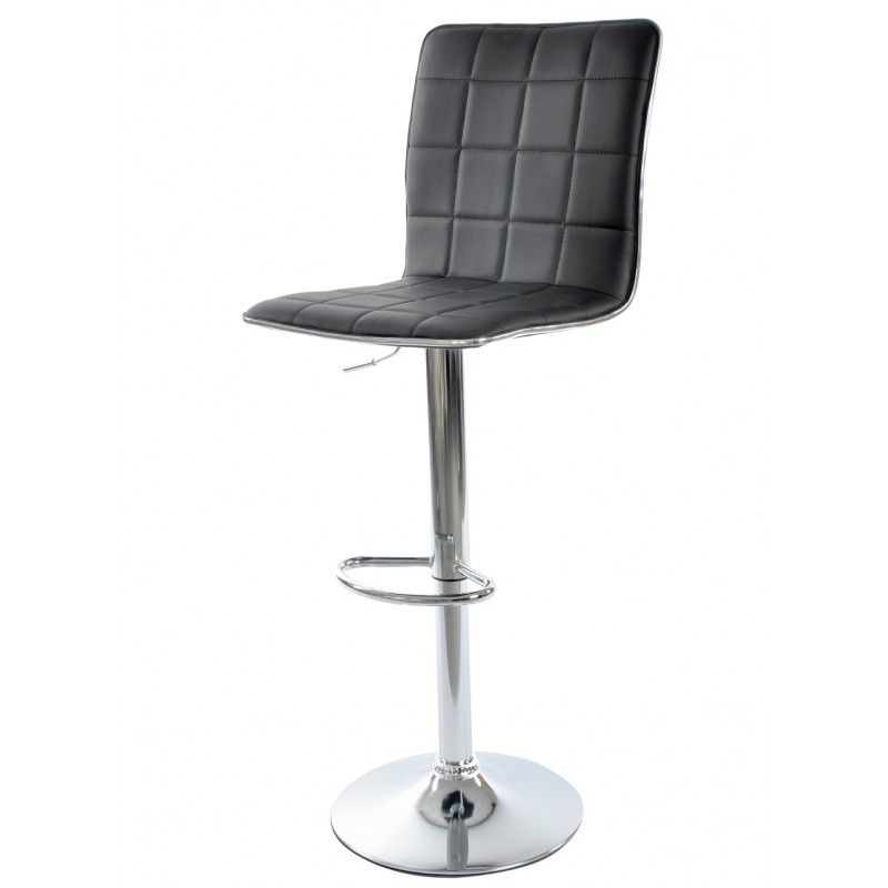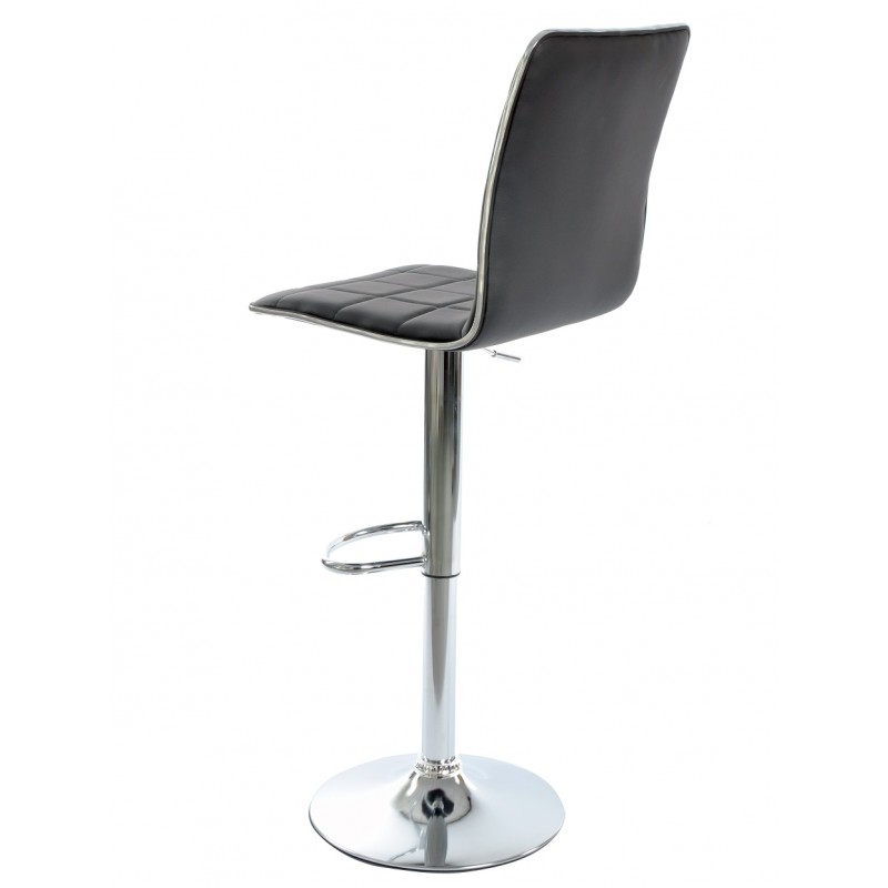 La base de metal cromado garantiza robustez y estabilidad, ofreciendo un aspecto luminoso y cuidado. El asiento de cuero sintético negro combina resistencia y facilidad de limpieza, adecuado para usos intensivos. La estructura metálica cuenta con ajuste de altura mediante pistón de gas, permitiendo una regulación precisa según las necesidades. Un reposapiés integrado mejora la comodidad del usuario.