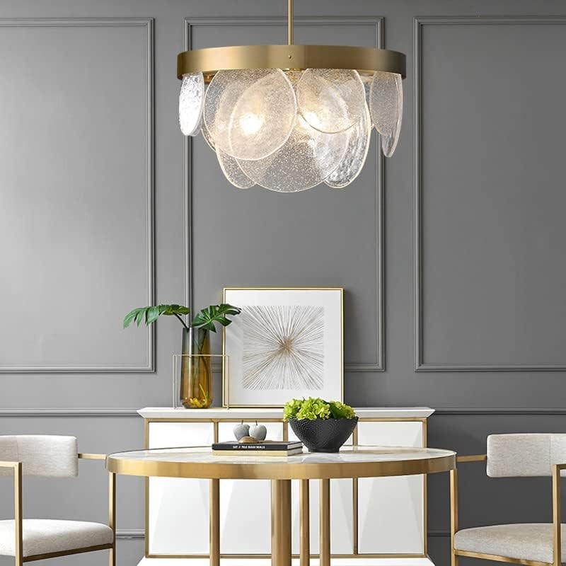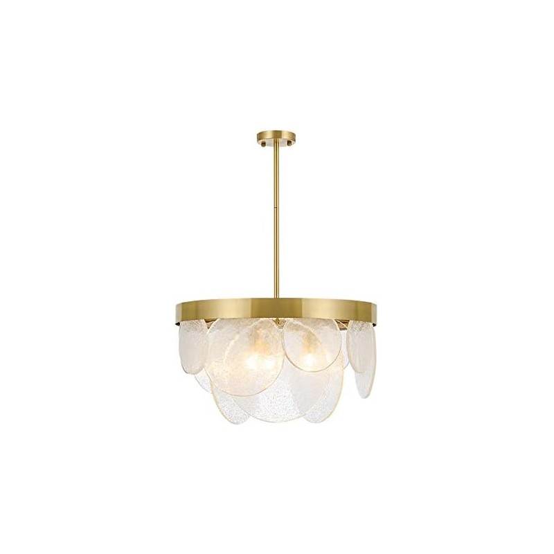 La lámpara colgante combina una estructura de metal dorado con una pantalla de vidrio transparente. Esta combinación de materiales proporciona robustez y ligereza visual. El metal garantiza la solidez necesaria para una instalación duradera, mientras que el vidrio difunde la luz de manera armoniosa. El conjunto cuenta con un acabado cuidadosamente trabajado para un resultado elegante.