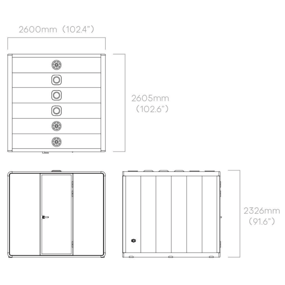 – Dimensions extérieures : 2326 mm (H) x 2600 mm (L) x 2487 mm (P)