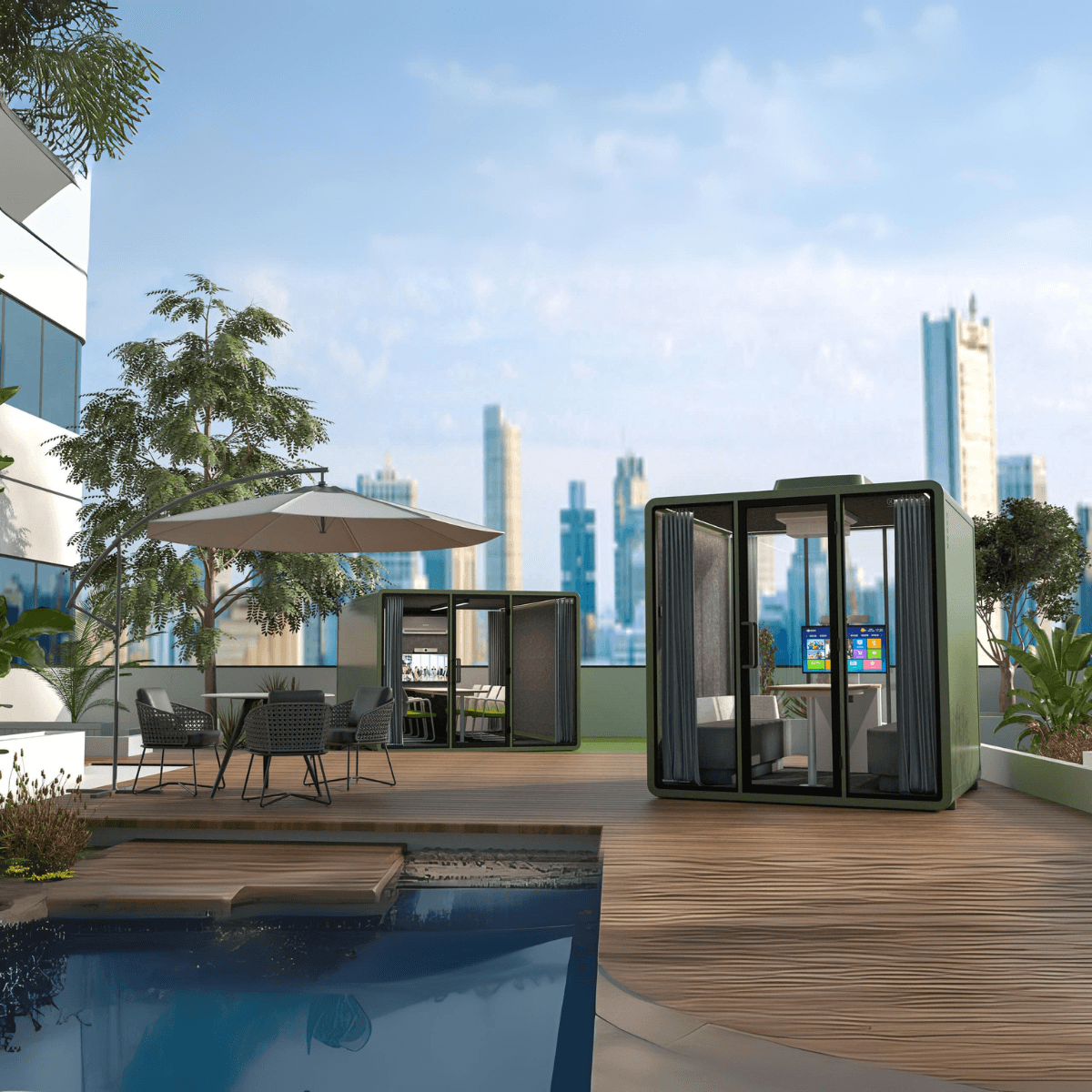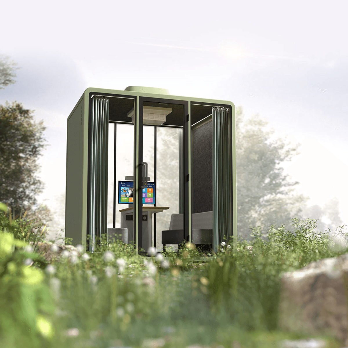 Cette cabine est idéale pour des environnements professionnels tels que les bureaux, les espaces de coworking ou les zones de détente en extérieur. Elle permet de créer un lieu de travail calme, propice à la concentration, tout en étant adaptée aux conditions climatiques variées. Son design moderne s’intègre parfaitement dans les espaces extérieurs des entreprises, des hôtels ou des lieux d’événements.