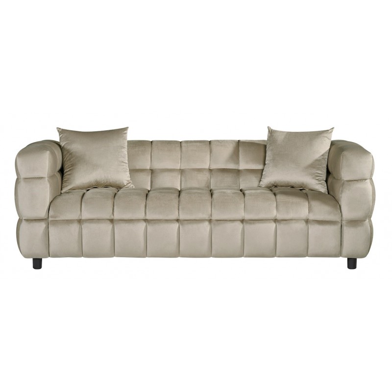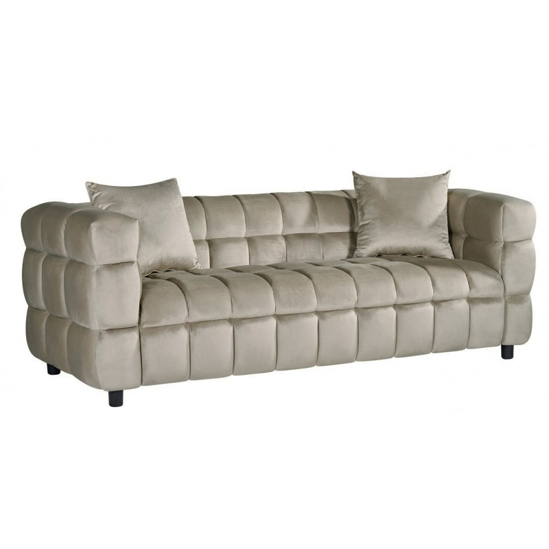 Ce canapé 3 places est entièrement tapissé d’un tissu velours gris clair, agréable au toucher et esthétique. Il est livré avec des coussins décoratifs assortis pour un confort et un style renforcés. Une version 2 places est également disponible en option. La possibilité de personnaliser la couleur du tissu permet d’adapter le produit aux chartes graphiques et ambiances spécifiques.