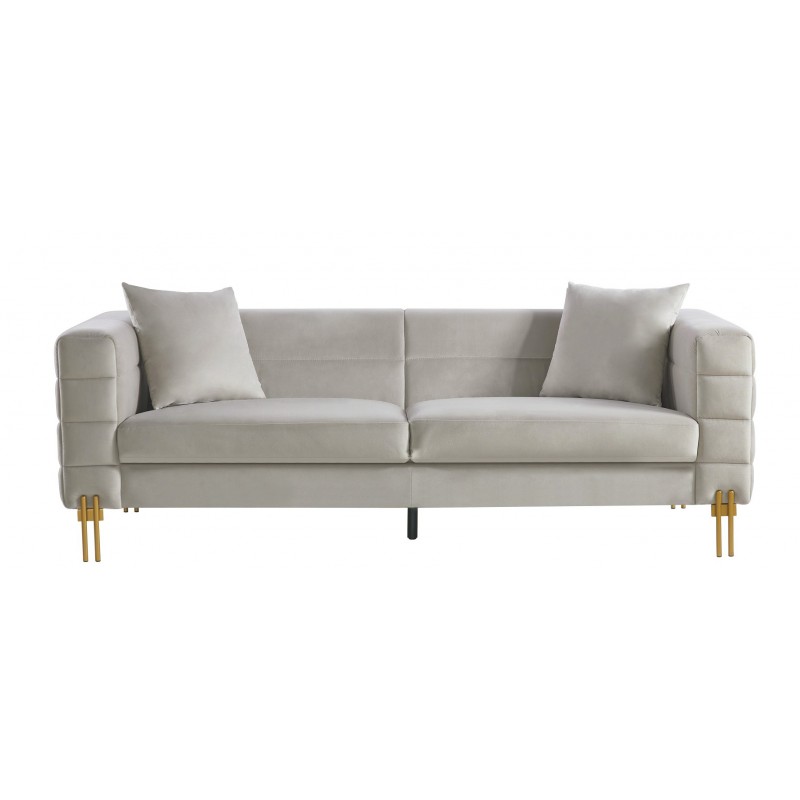 Ce canapé repose sur une structure intérieure en bois, associée à une mousse haute densité pour un confort optimal. Les pieds métalliques, dotés d’une finition dorée, apportent stabilité et élégance à l’ensemble.