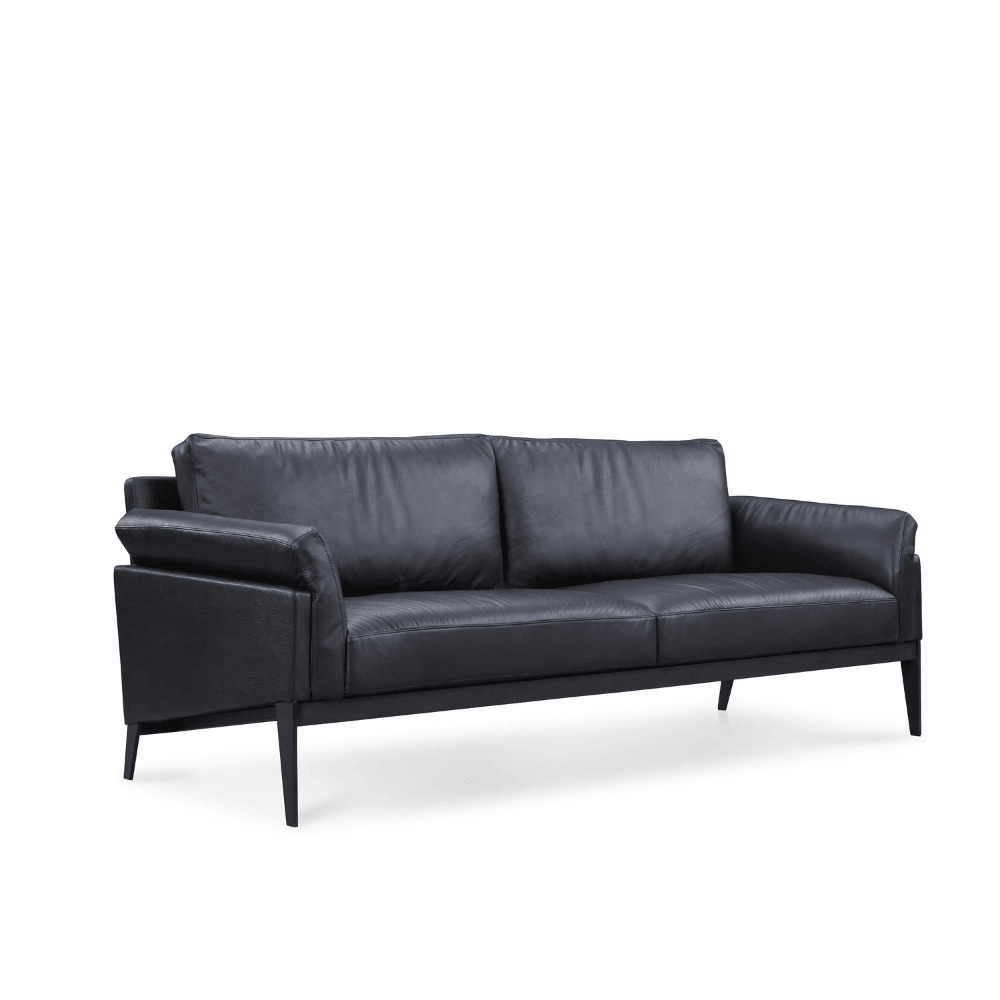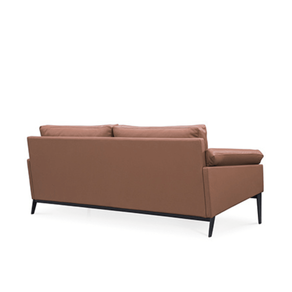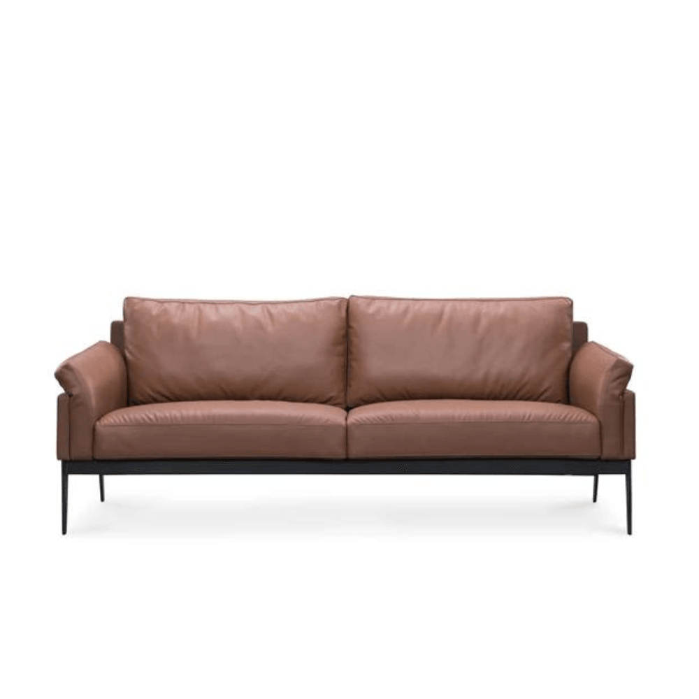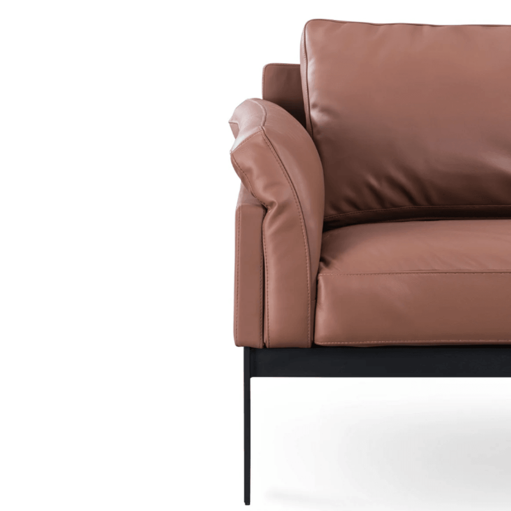 Le canapé est doté d’une structure en bois massif, assurant robustesse et durabilité. Son rembourrage en mousse haute élasticité offre un confort optimal. La finition en cuir apporte une touche de sophistication, tandis que la base en acier noir garantit une stabilité accrue.