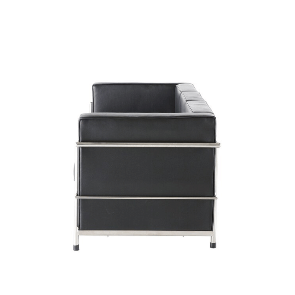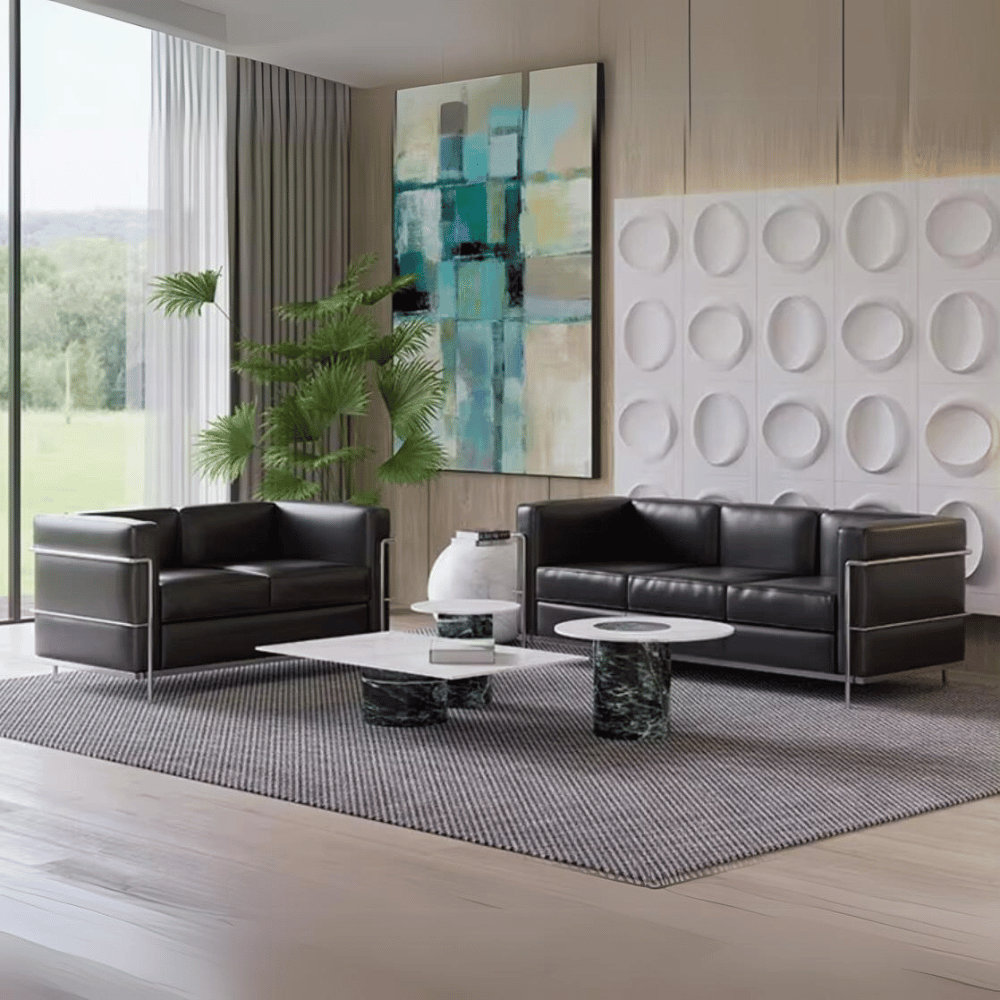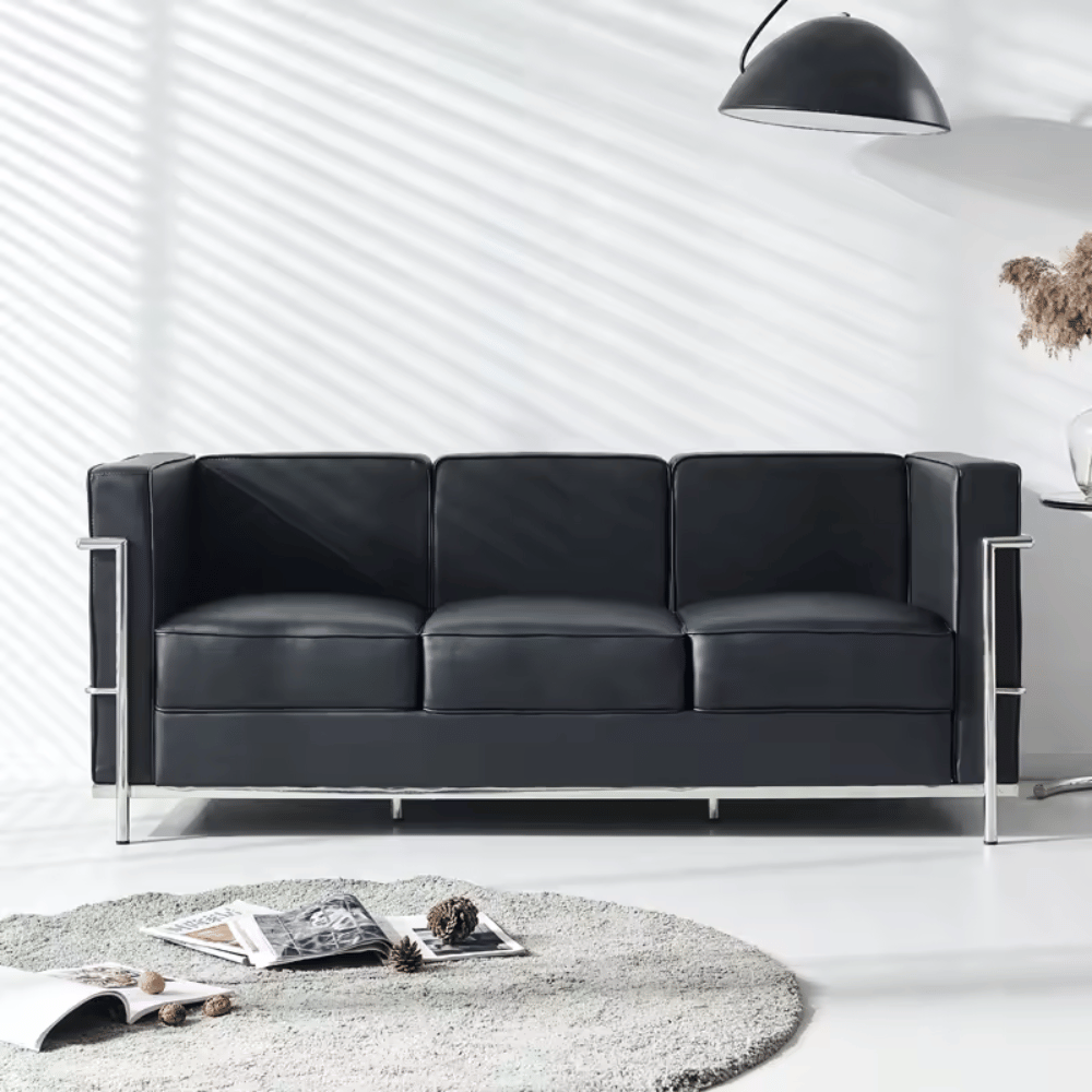 Le canapé est conçu avec un cadre en acier inoxydable solide, garantissant robustesse et durabilité. Son revêtement est en cuir, offrant un rendu élégant et un toucher agréable. Les coussins en mousse élastique haute densité assurent un confort optimal pour une utilisation prolongée.