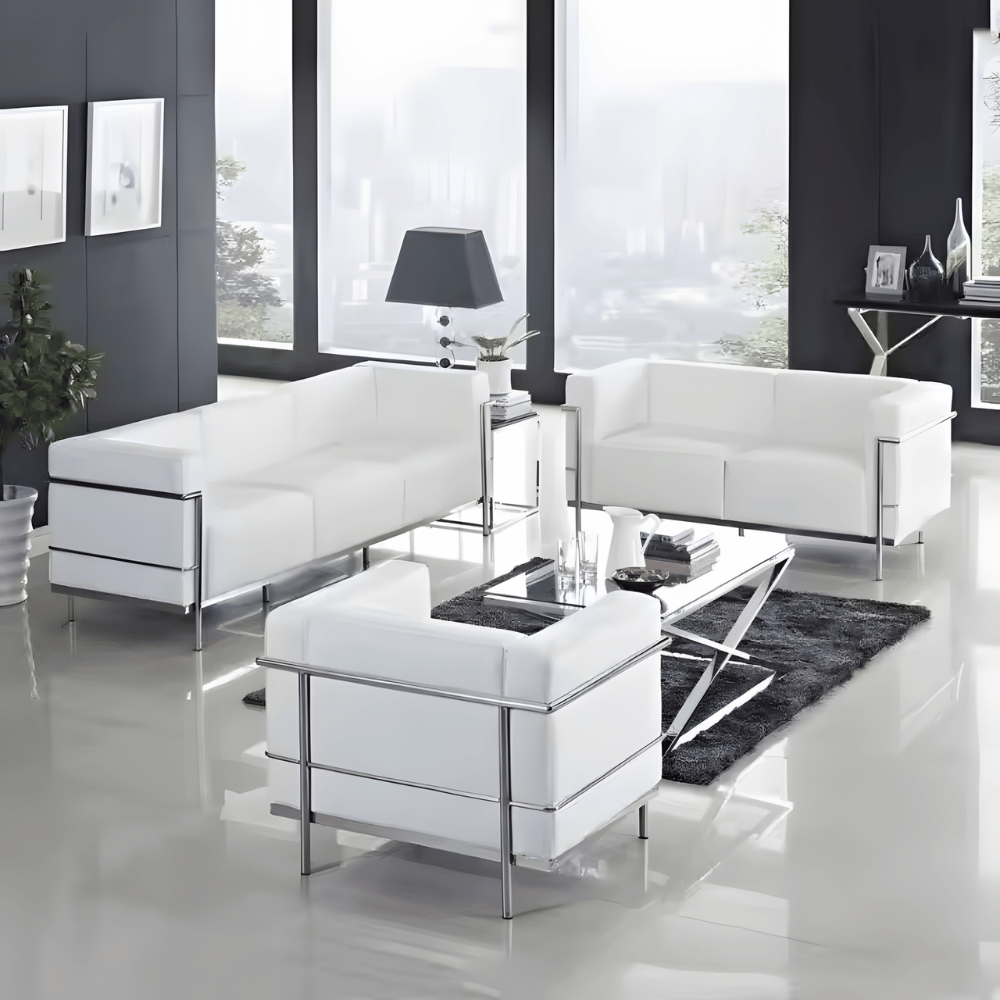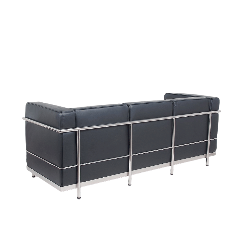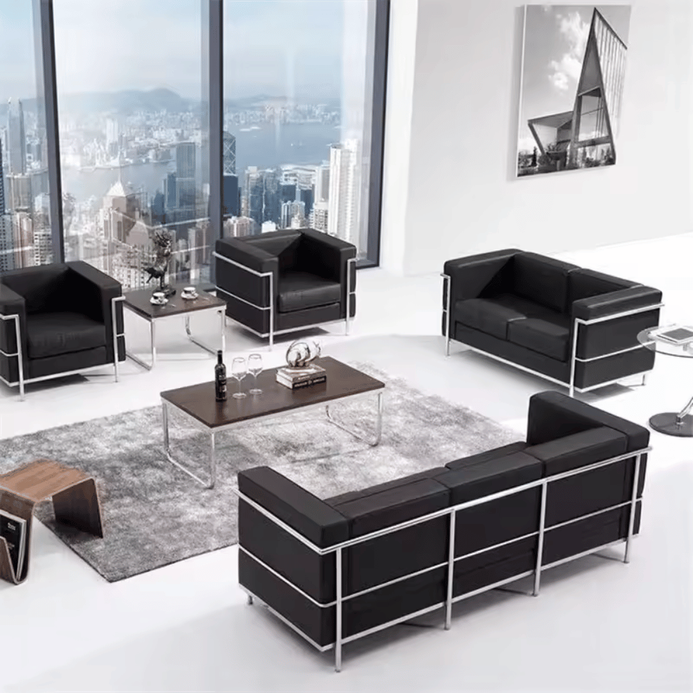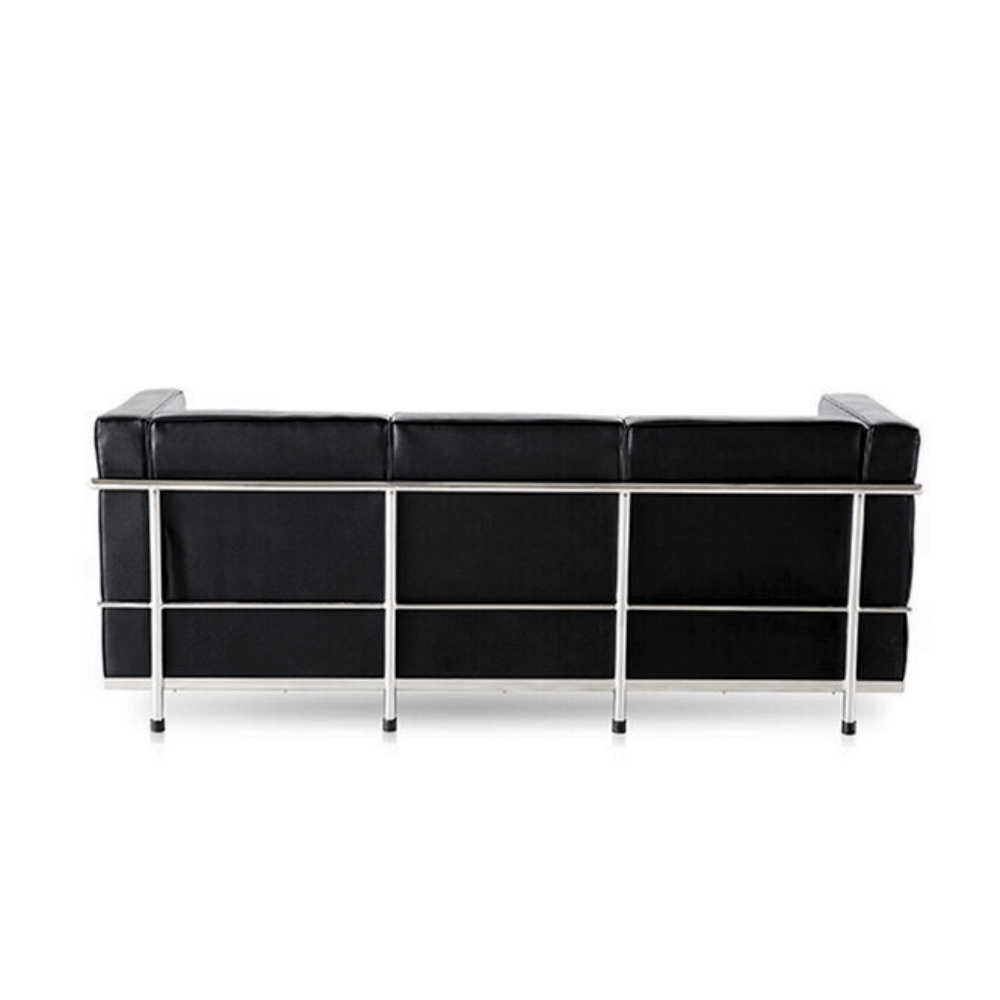 Le canapé est conçu avec un cadre en acier inoxydable solide, garantissant robustesse et durabilité. Son revêtement est en cuir, offrant un rendu élégant et un toucher agréable. Les coussins en mousse élastique haute densité assurent un confort optimal pour une utilisation prolongée.