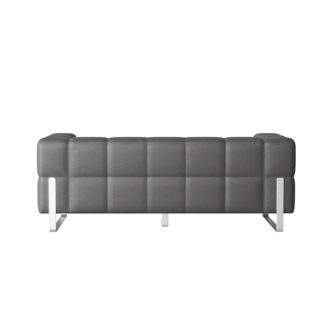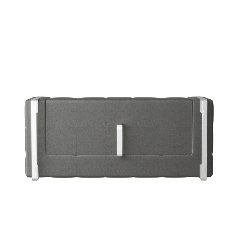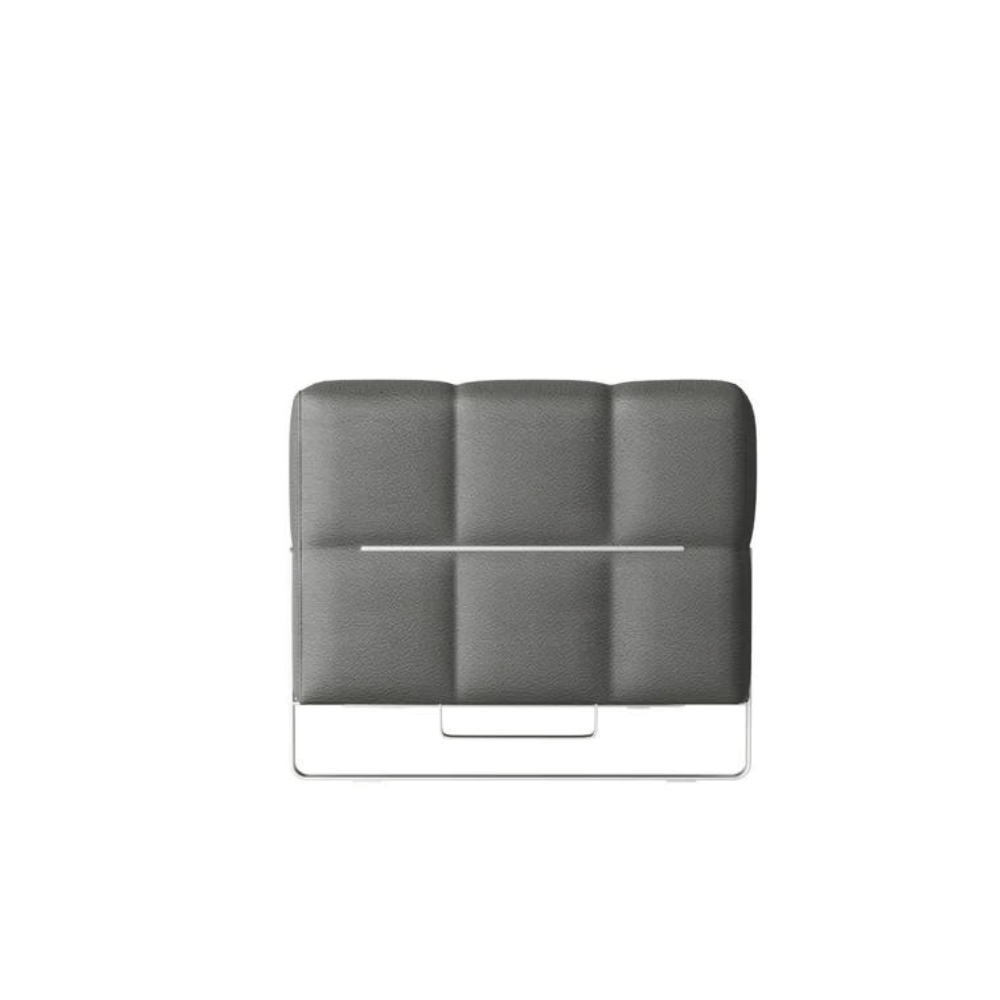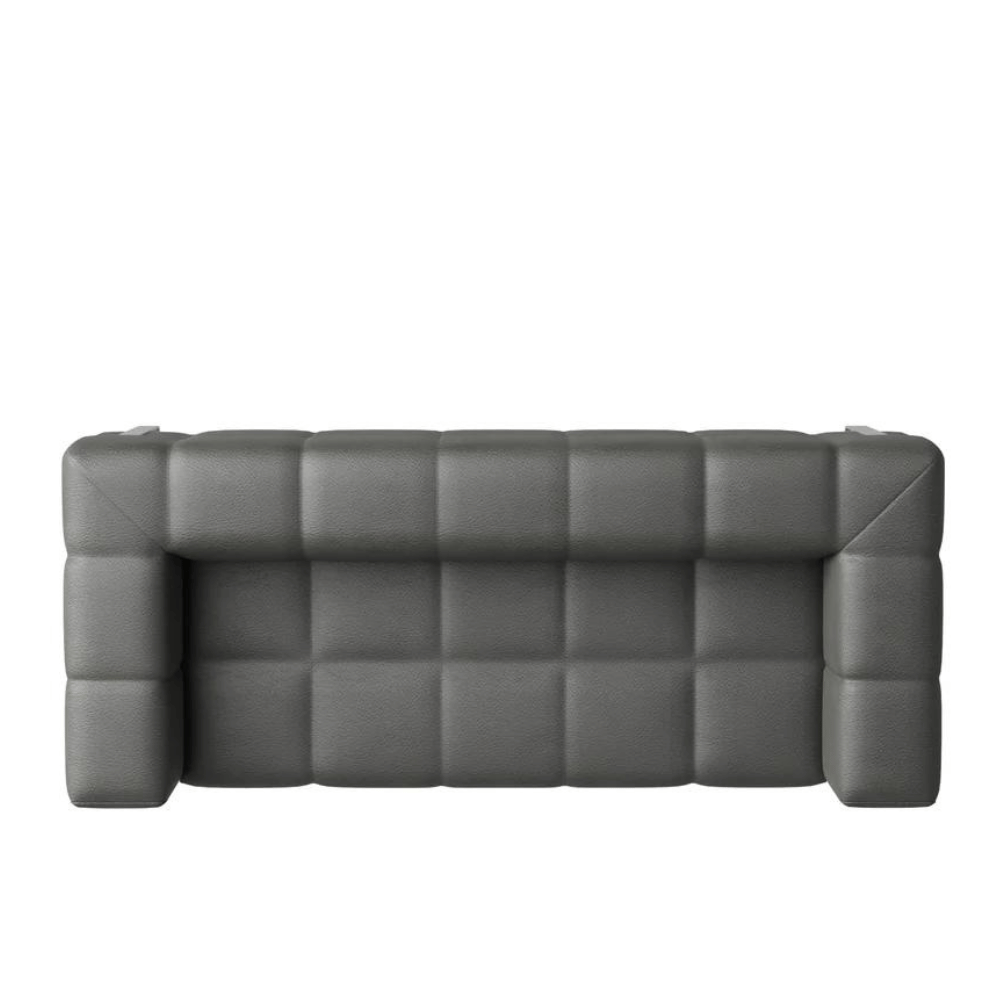 Le canapé présente une base en forme de U, offrant une stabilité et une solidité accrues. Sa conception repose sur des éléments carrés répétés, créant une texture visuelle attrayante. Les détails en métal sur les côtés apportent une touche de sophistication et de modernité.