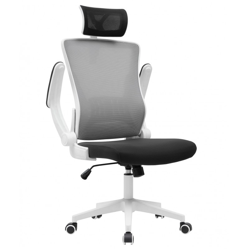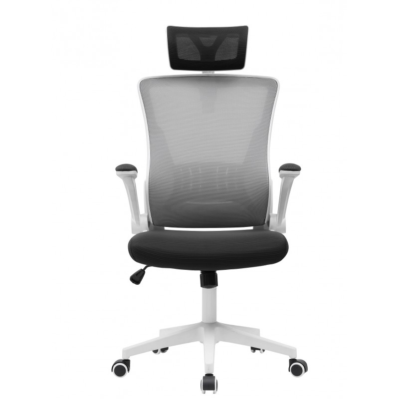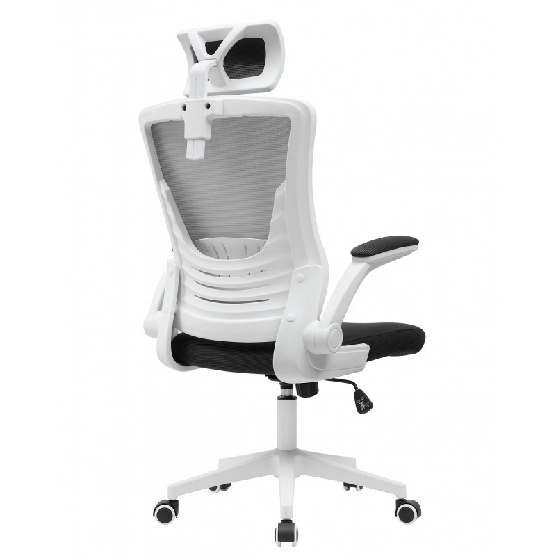 La structure en nylon blanc assure robustesse et légèreté, tandis que le dossier en maille grise favorise une bonne aération pour un confort optimal. L’assise noire, rembourrée en tissu, offre un soutien agréable. Les accoudoirs relevables avec rembourrage en maille ajoutent une flexibilité d’usage. La base en nylon blanc est équipée de roulettes souples de 50 mm pour faciliter les déplacements sans bruit.