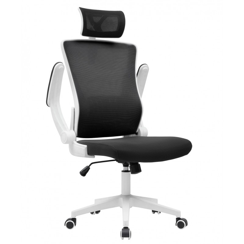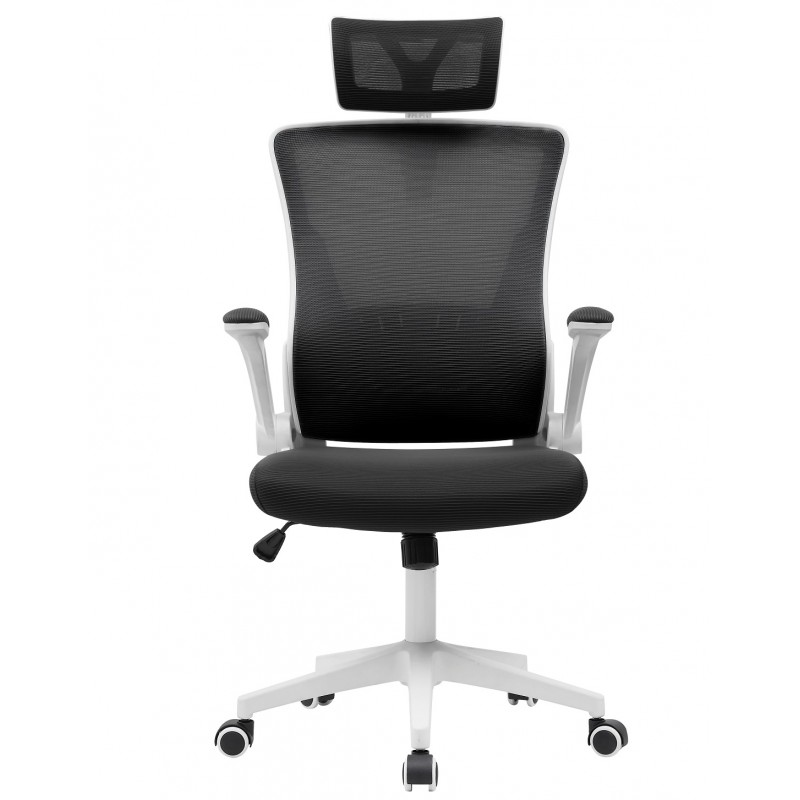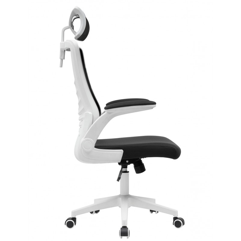 La structure en nylon blanc assure robustesse et légèreté. Le dossier haut en maille noire favorise la respirabilité et un maintien optimal du dos. L’assise en tissu noir combine confort et résistance à l’usage quotidien. Les accoudoirs relevables avec rembourrage en maille apportent une flexibilité supplémentaire à l’utilisateur. La base en nylon blanc est équipée de roulettes silencieuses pour faciliter les déplacements.