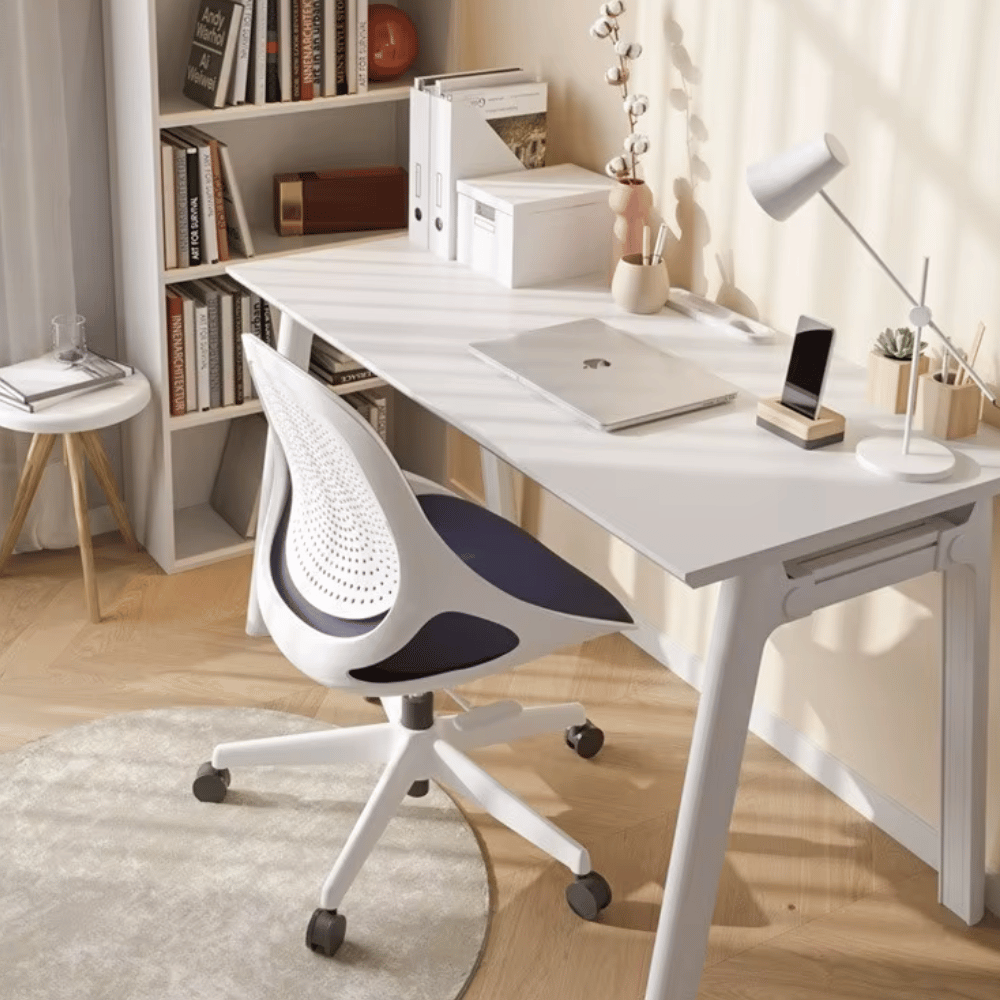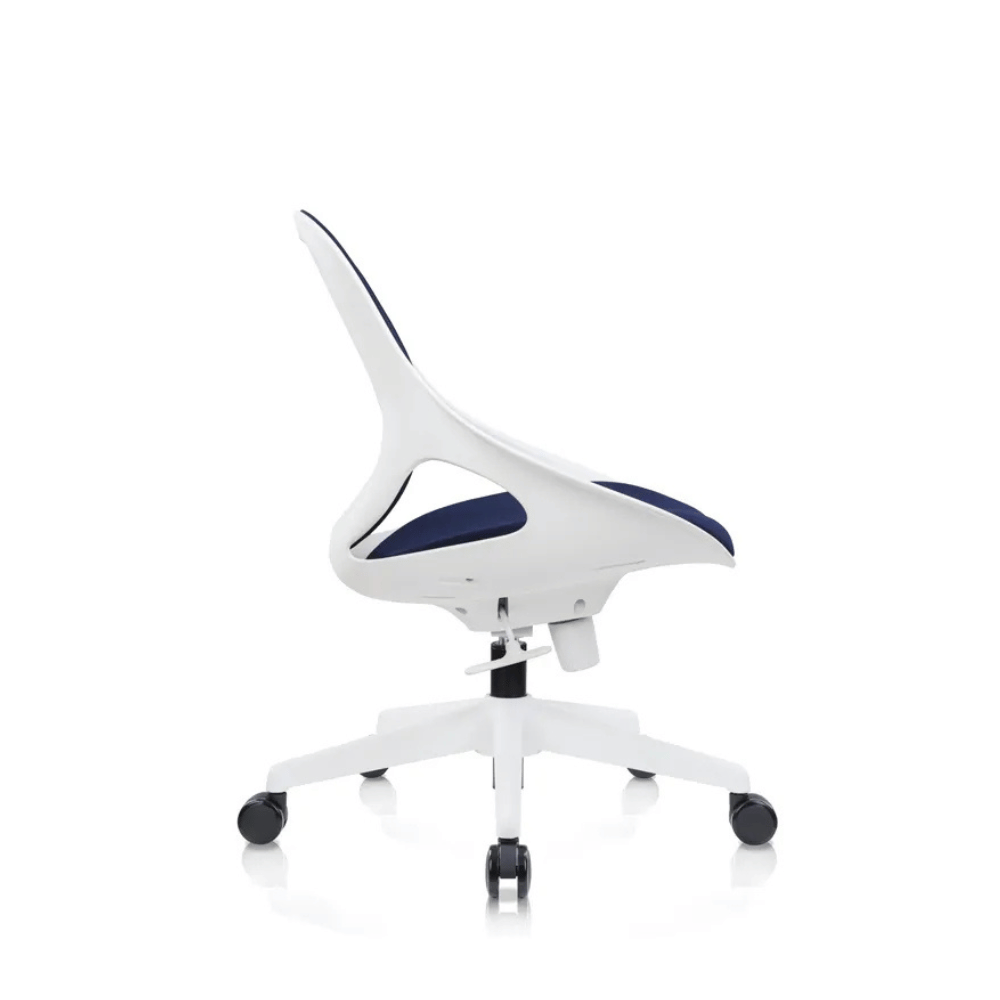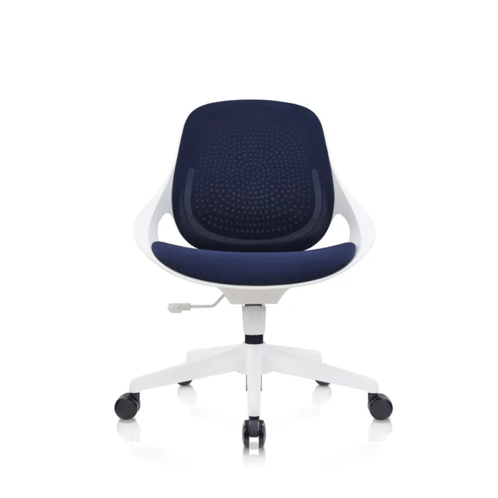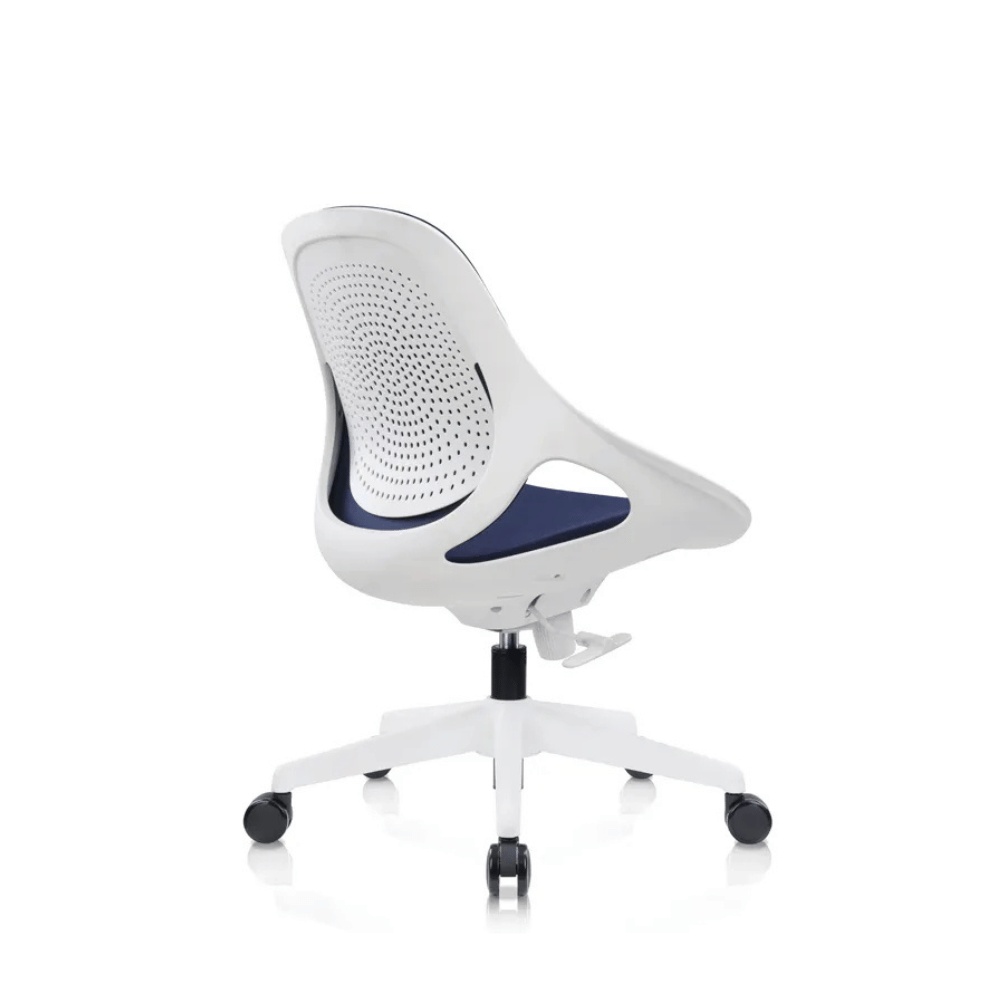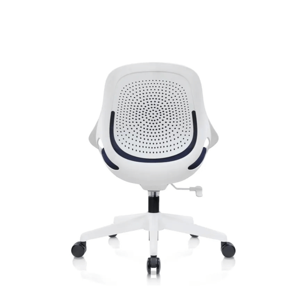 La chaise est dotée d’un dossier en maille haute densité, offrant un soutien flexible et respirant pour le bas du dos. Sa base robuste assure une stabilité optimale, tandis que les roulettes permettent un déplacement fluide et silencieux.