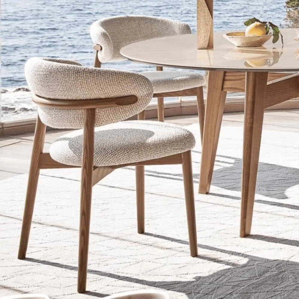 La structure de la chaise est en bois de frêne massif, assurant une stabilité et une durabilité exceptionnelles. L’assise est rembourrée avec une mousse polyuréthane haute densité, garantissant un confort optimal même après de longues heures d’utilisation. Le revêtement est disponible en tissu lin ou en simili cuir, offrant une touche d’élégance.