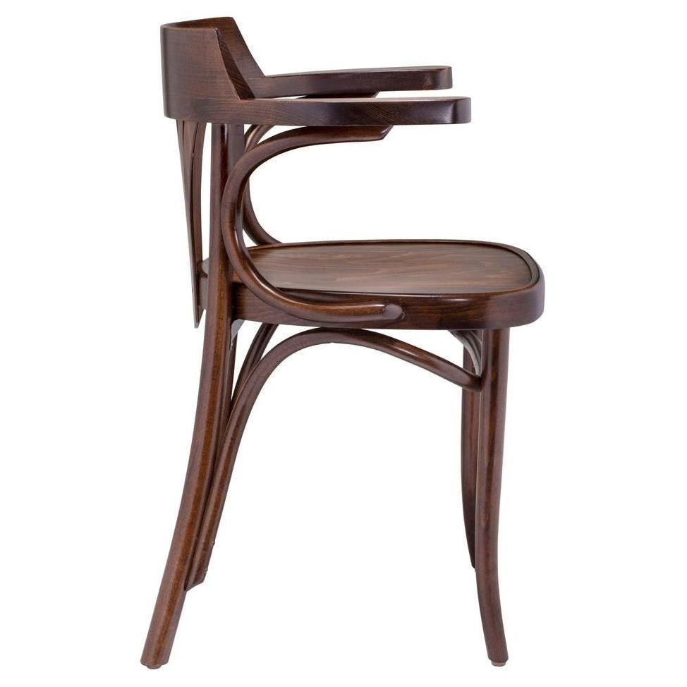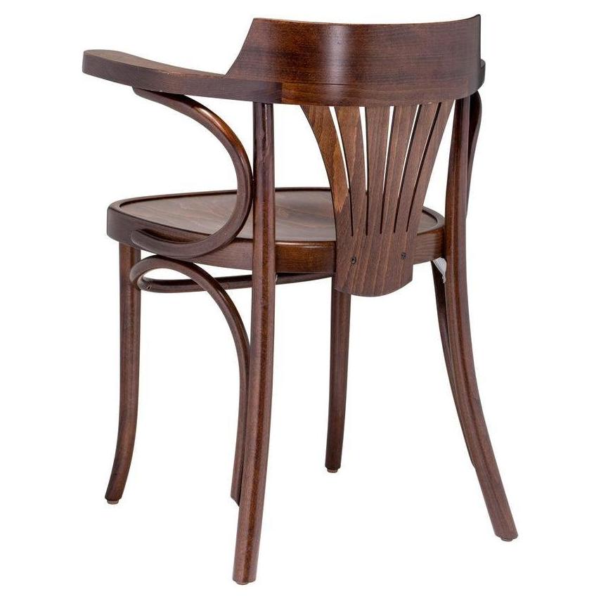 Ce fauteuil en bois cintré se distingue par son dossier en éventail, alliant confort et esthétique,