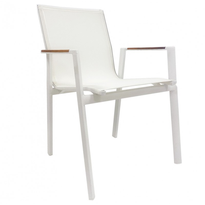 La structure repose sur un cadre en aluminium laqué blanc, garantissant légèreté et résistance à la corrosion. L’assise et le dossier sont réalisés en textilène blanc, un matériau respirant et facile d’entretien. Les accoudoirs en bois de teck apportent une touche naturelle et une prise en main agréable.