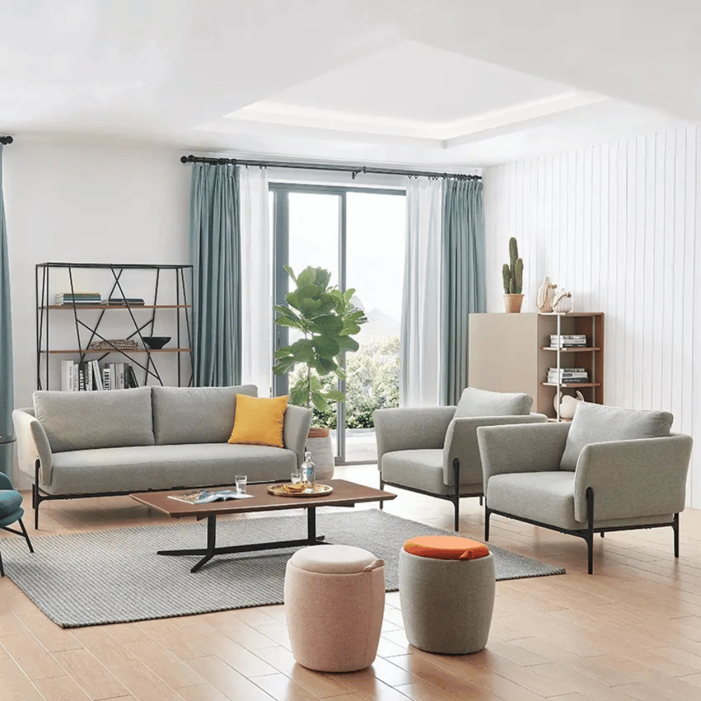 Sa structure est en bois de mélèze importé, assurant une stabilité et une durabilité. Le rembourrage en mousse polyuréthane offre une excellente résilience, garantissant un confort prolongé sans déformation. Les pieds en métal peint ajoutent une touche moderne tout en garantissant une bonne tenue.
