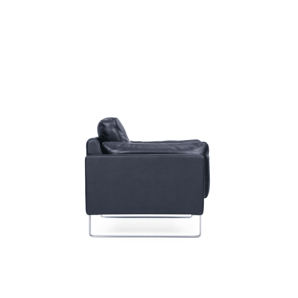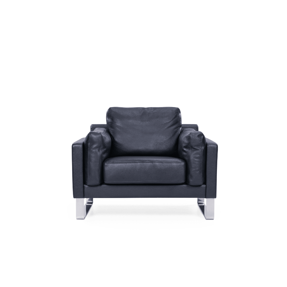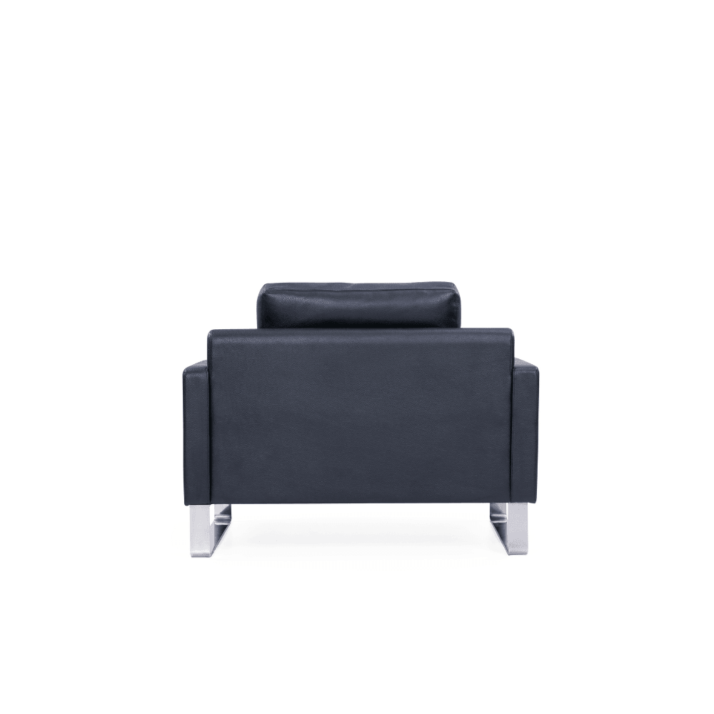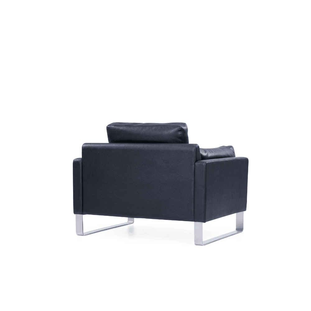 Le fauteuil est revêtu de cuir PU de haute qualité ou de cuir Pleven importé du Brésil, offrant un aspect raffiné. Sa structure est composée d’un cadre en bois massif, soigneusement poli et séché, garantissant robustesse et durabilité. Le coussin intérieur est rempli de plumes, tandis que l’assise est renforcée par une mousse haute densité.