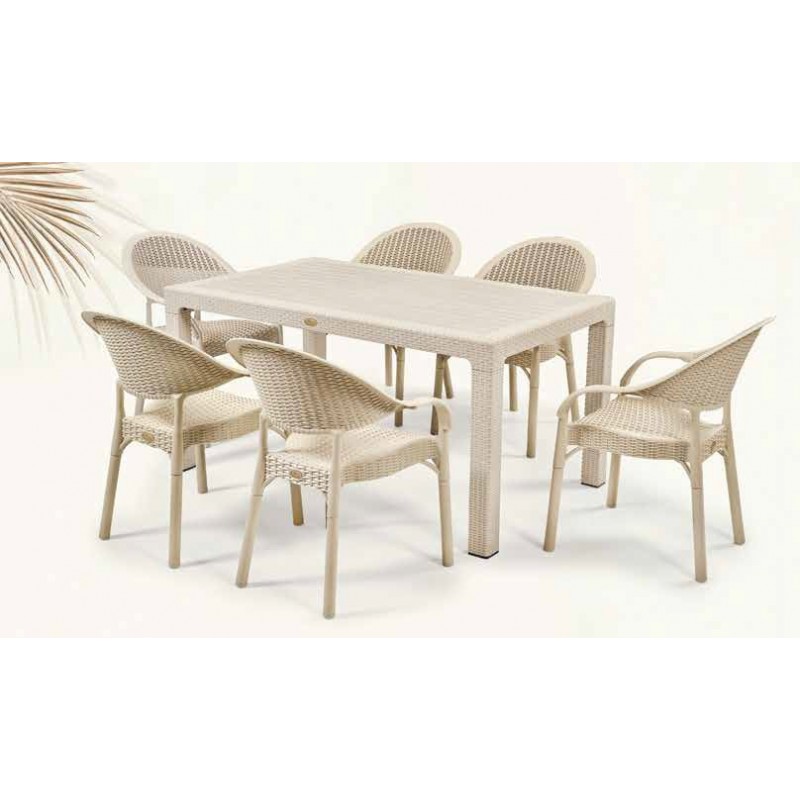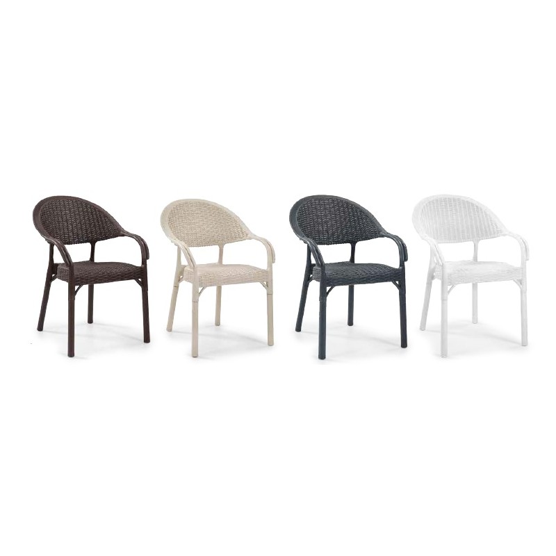 La coque est réalisée en polypropylène recyclable de couleur cappuccino, imitant l’aspect rotin pour un rendu esthétique et naturel. Les pieds métalliques assurent une excellente stabilité et solidité. Le traitement anti-UV et anti-statique protège le fauteuil, prolongeant ainsi sa durée de vie même en extérieur.