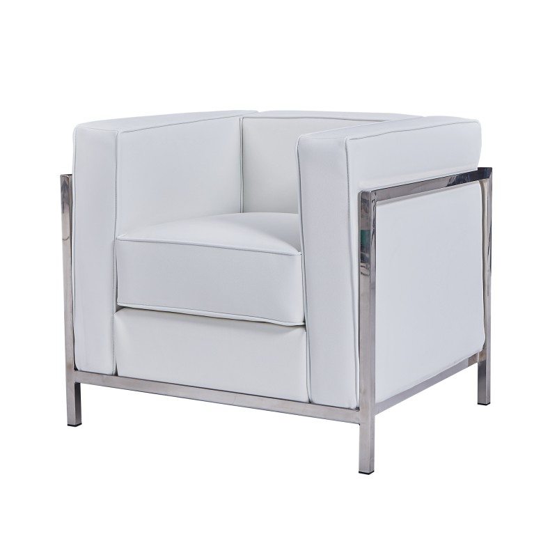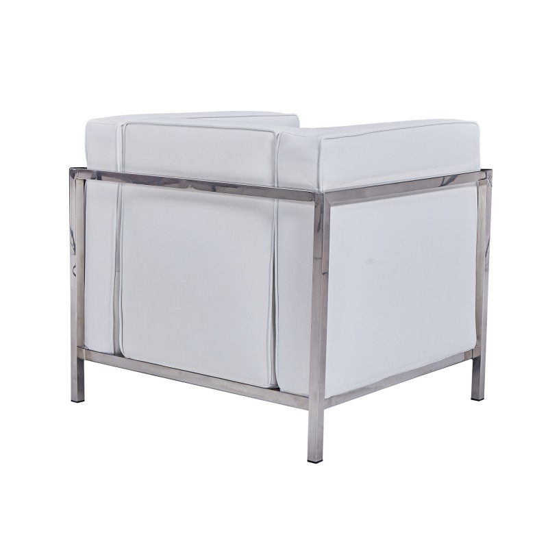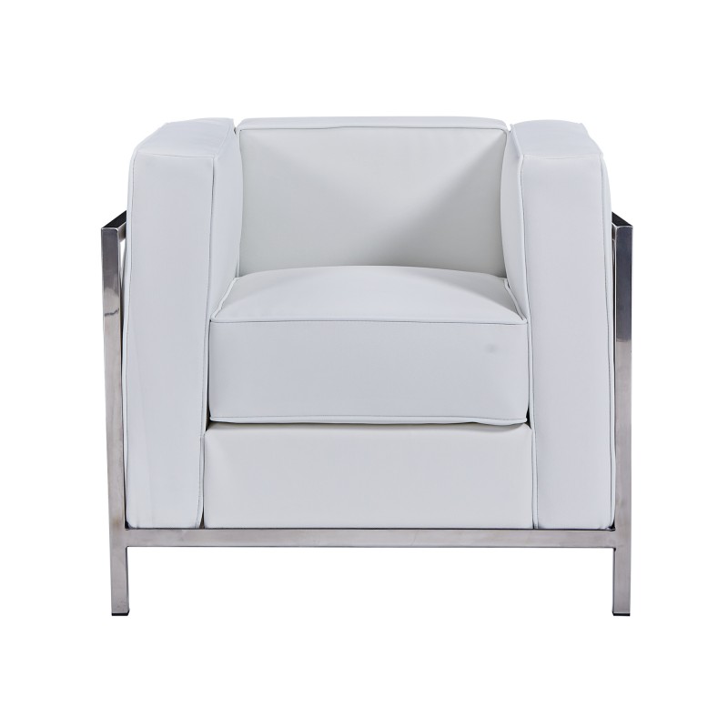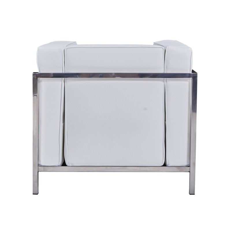 Il repose sur une structure tubulaire en acier inoxydable, assurant robustesse et légèreté. L’assise est garnie de mousse haute densité pour un confort durable, habillée d’un revêtement en cuir synthétique blanc.