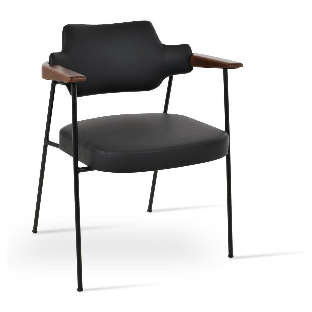 • Structure / matériaux : Sa structure est en métal avec des pieds en finition noire mate, tandis que les accoudoirs sont en bois avec des finitions en noyer et naturel,