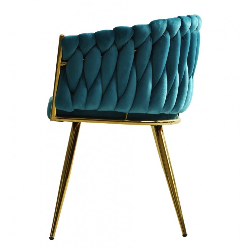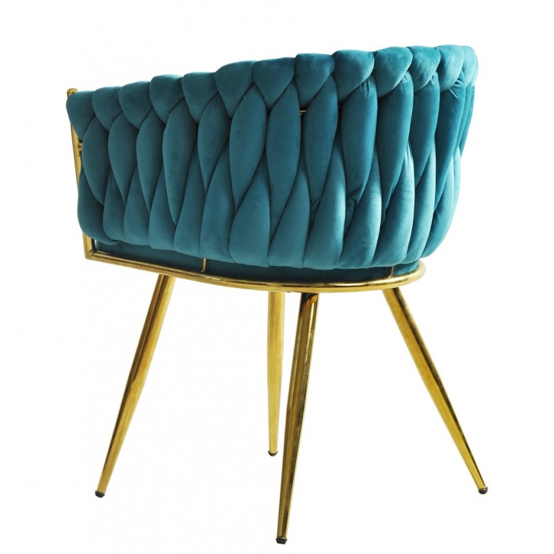 La structure en métal doré confère solidité et stabilité à ce fauteuil. Le revêtement en velours turquoise apporte douceur et une esthétique sophistiquée. Ce choix de matériaux garantit une bonne tenue dans le temps tout en facilitant l’entretien.