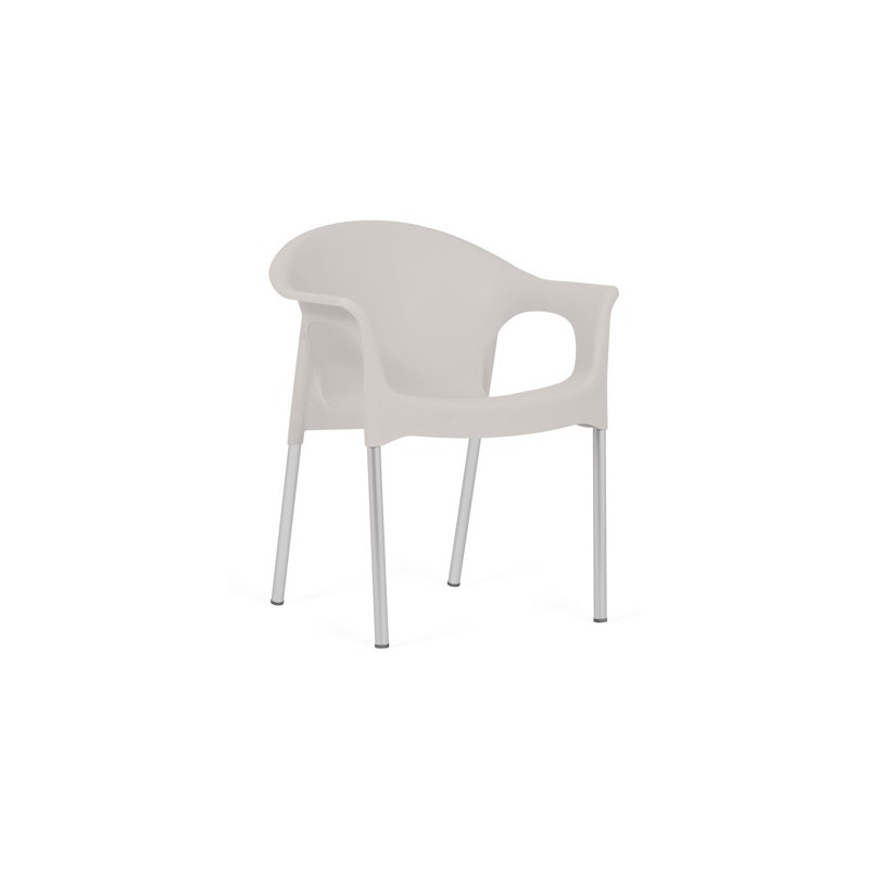 Le fauteuil repose sur une structure en aluminium gris clair, légère et durable. L’assise et le dossier en polypropylène apportent confort et facilité d’entretien. Le choix de matériaux adaptés permet une utilisation extérieure grâce à leur résistance aux intempéries. La conception empilable assure un gain de place optimal lors du rangement.