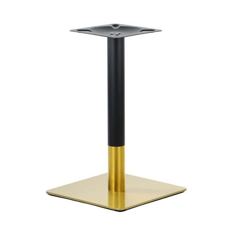La structure repose sur une plaque en acier inoxydable de qualité, assurant solidité et durabilité. La colonne de 50 mm de diamètre combine une finition dorée brillante et un revêtement noir mat pour un contraste raffiné. La base carrée de 45 × 45 cm garantit une excellente stabilité, même sous une charge importante.