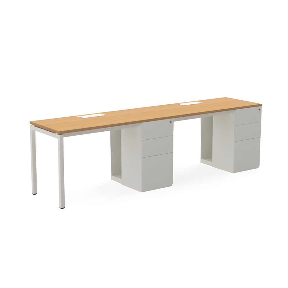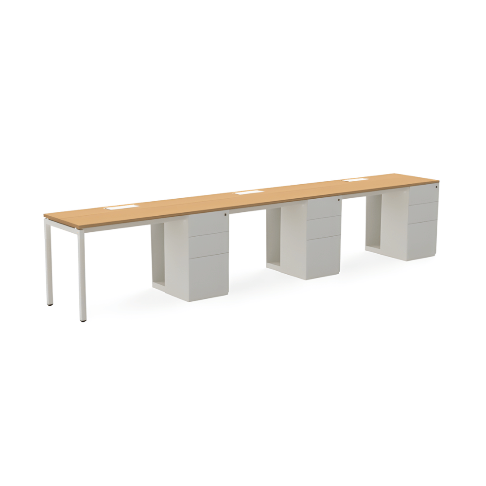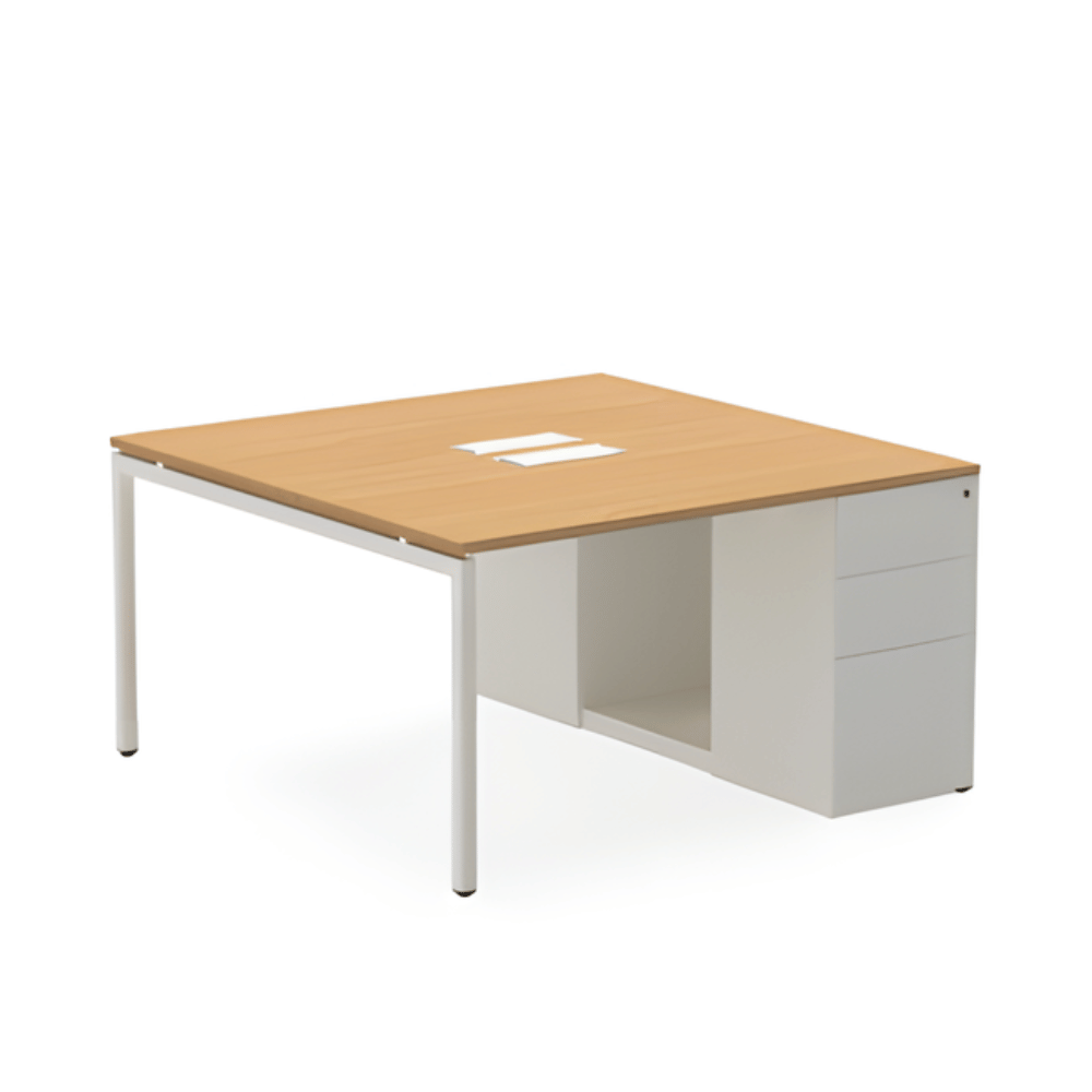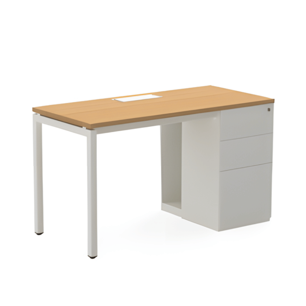 Le poste de travail est doté d’une structure en métal robuste, garantissant une excellente stabilité. Le plateau de table, d’une épaisseur de 25 mm, est en aggloméré mélaminé, offrant une surface de travail durable. Le caisson latéral à trois tiroirs assure un rangement pratique et optimisé.