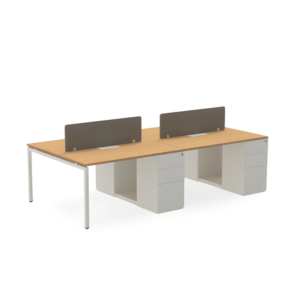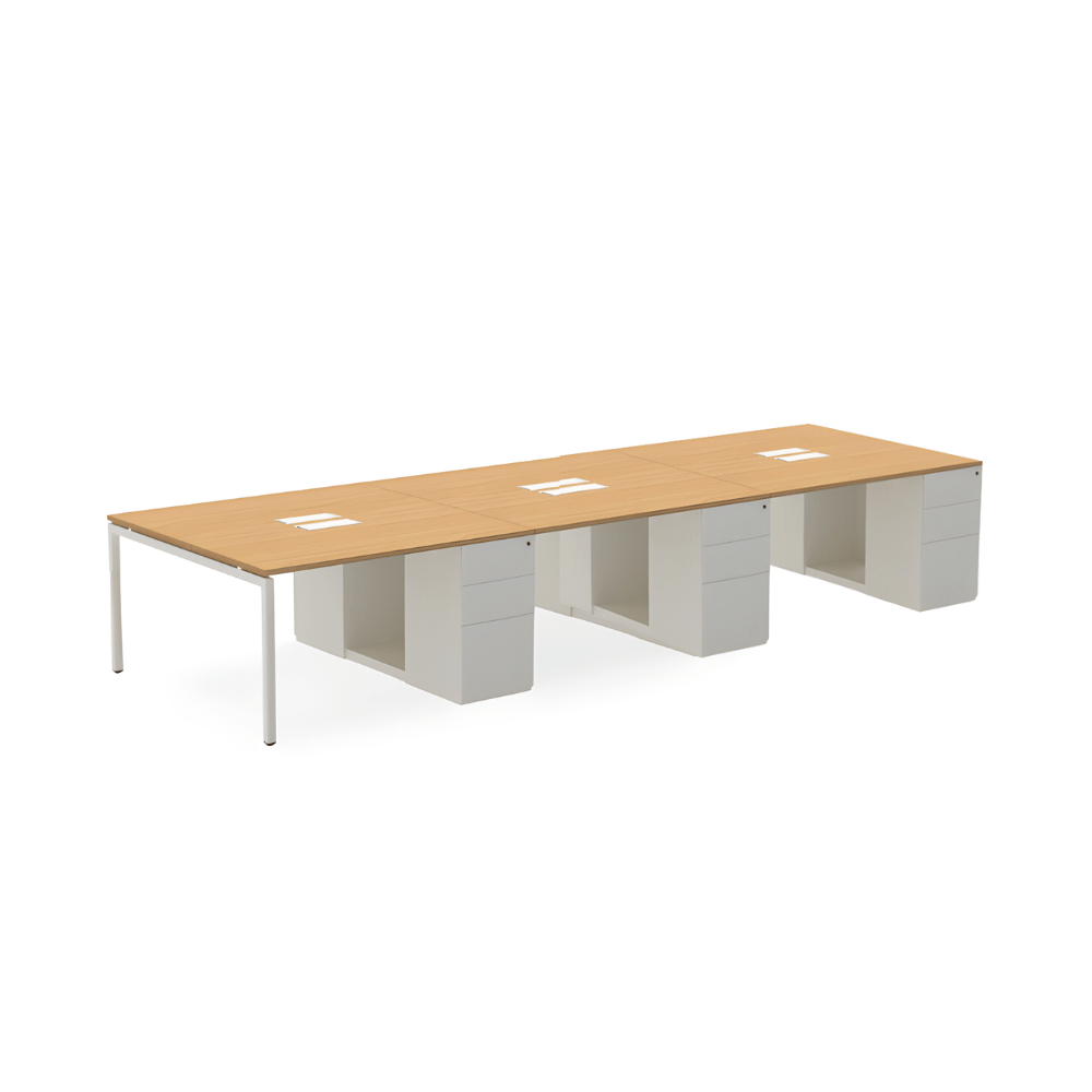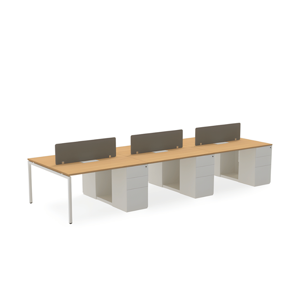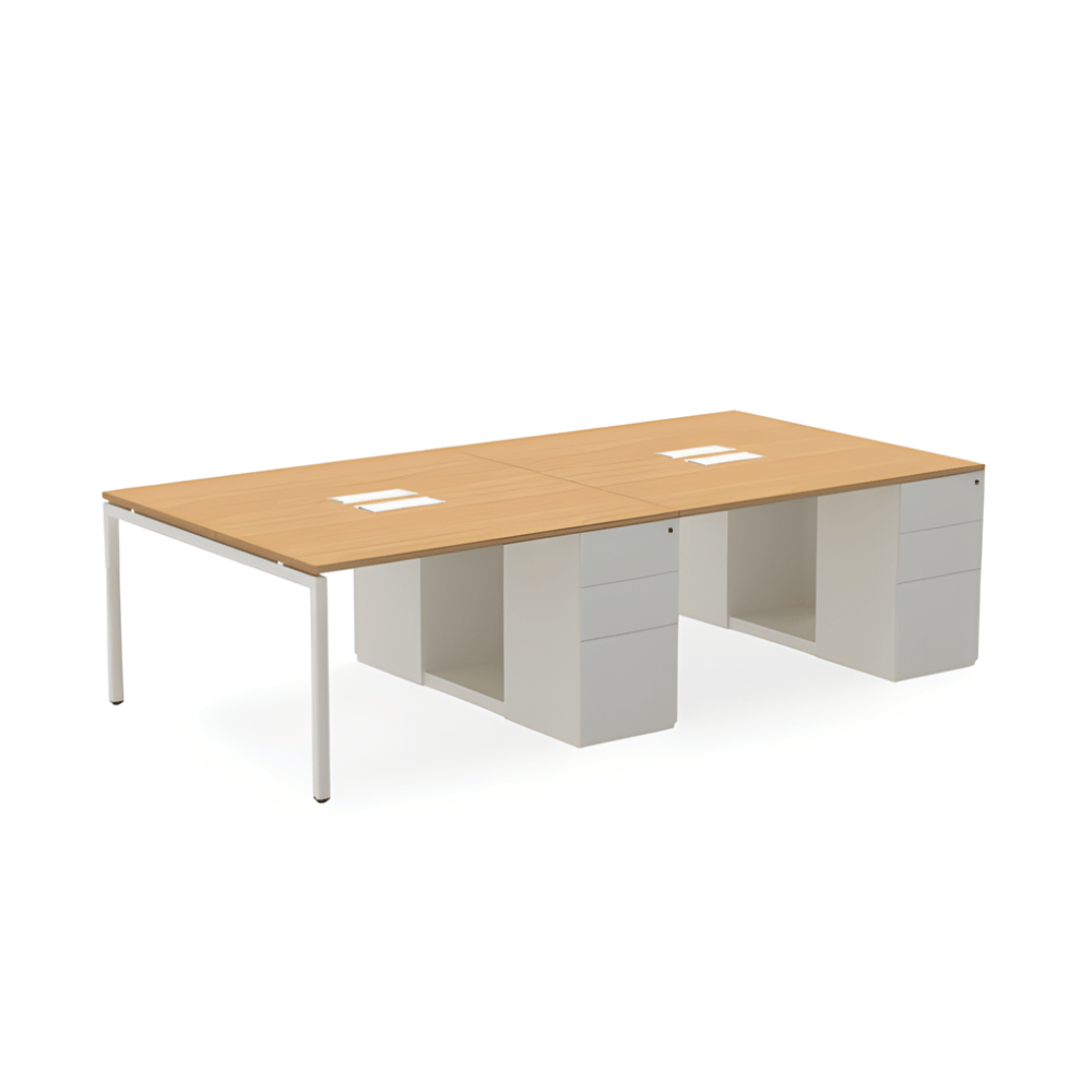 Le poste de travail est doté d’une structure en métal robuste, garantissant une excellente stabilité. Le plateau de table, d’une épaisseur de 25 mm, est en aggloméré mélaminé, offrant une surface de travail durable. Le caisson latéral à trois tiroirs assure un rangement pratique et optimisé.