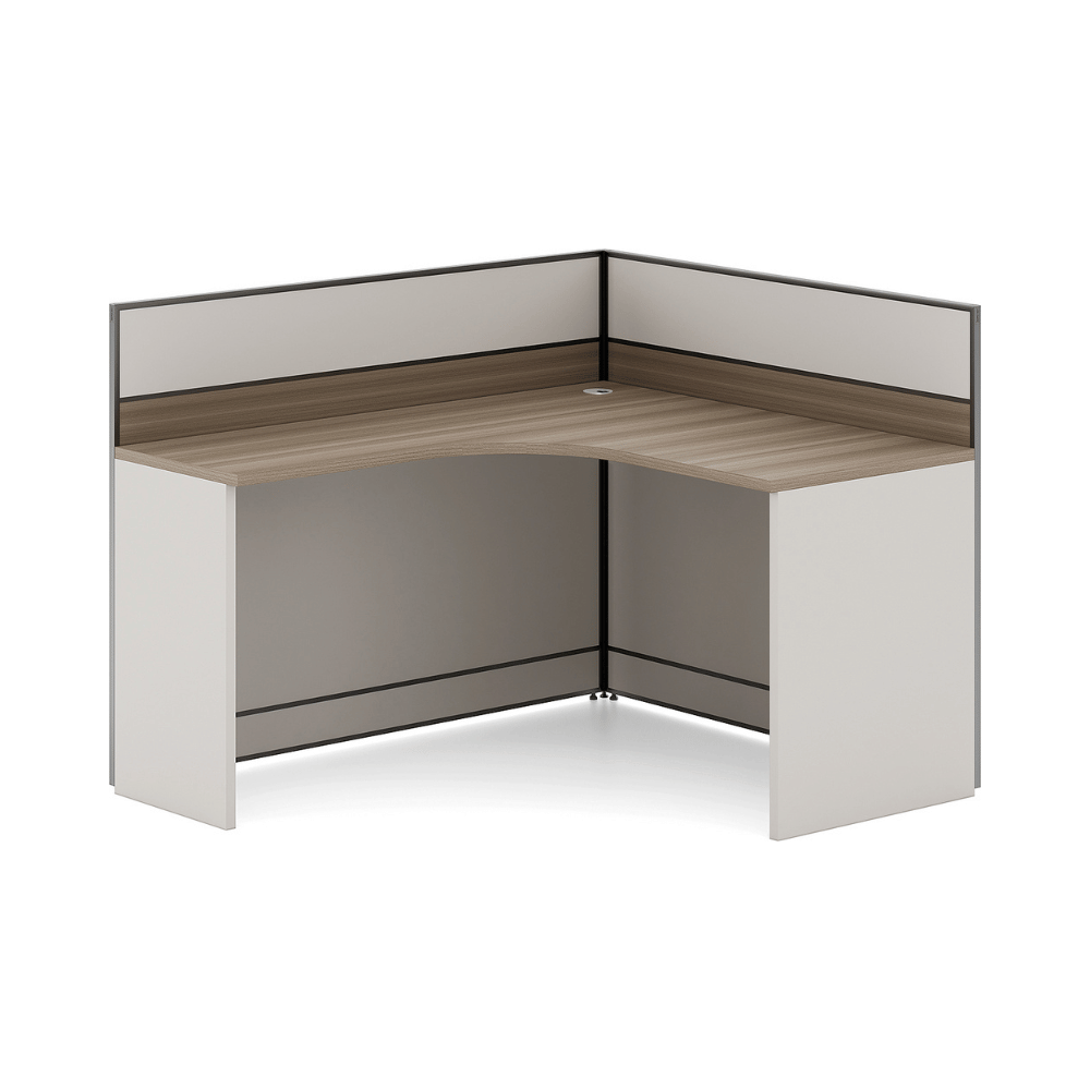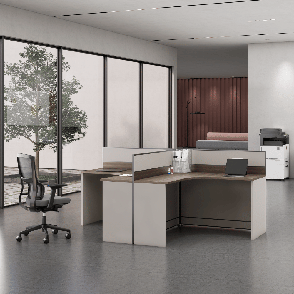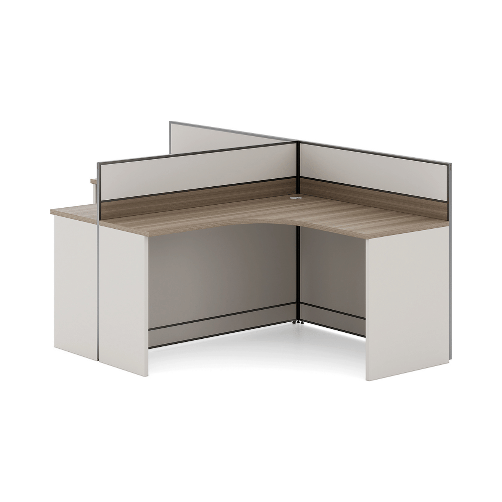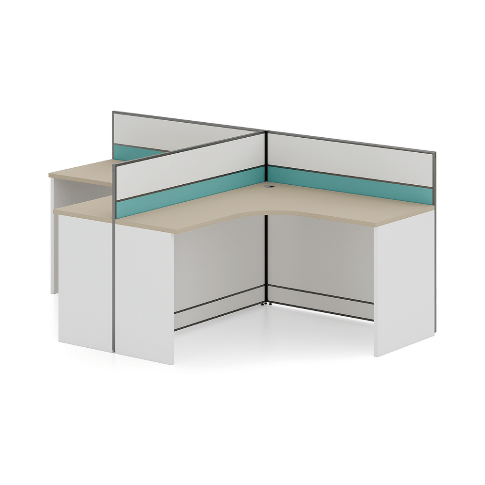 Le bureau est constitué d’un plateau en bois de 25 mm d’épaisseur, offrant une surface robuste et durable. La finition en placage importé d’Allemagne assure une esthétique soignée et professionnelle. Les panneaux de séparation sont disponibles dans une variété de couleurs personnalisables, permettant une intégration harmonieuse dans différents décors.
