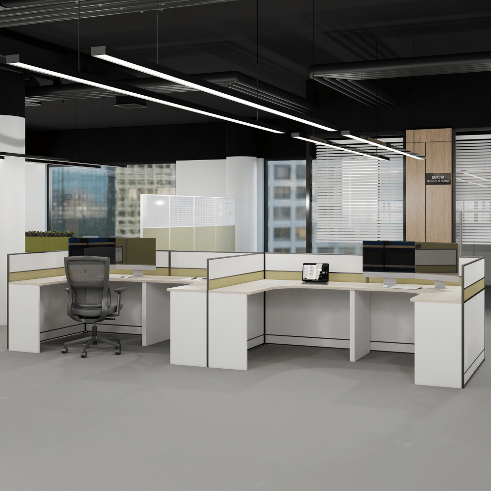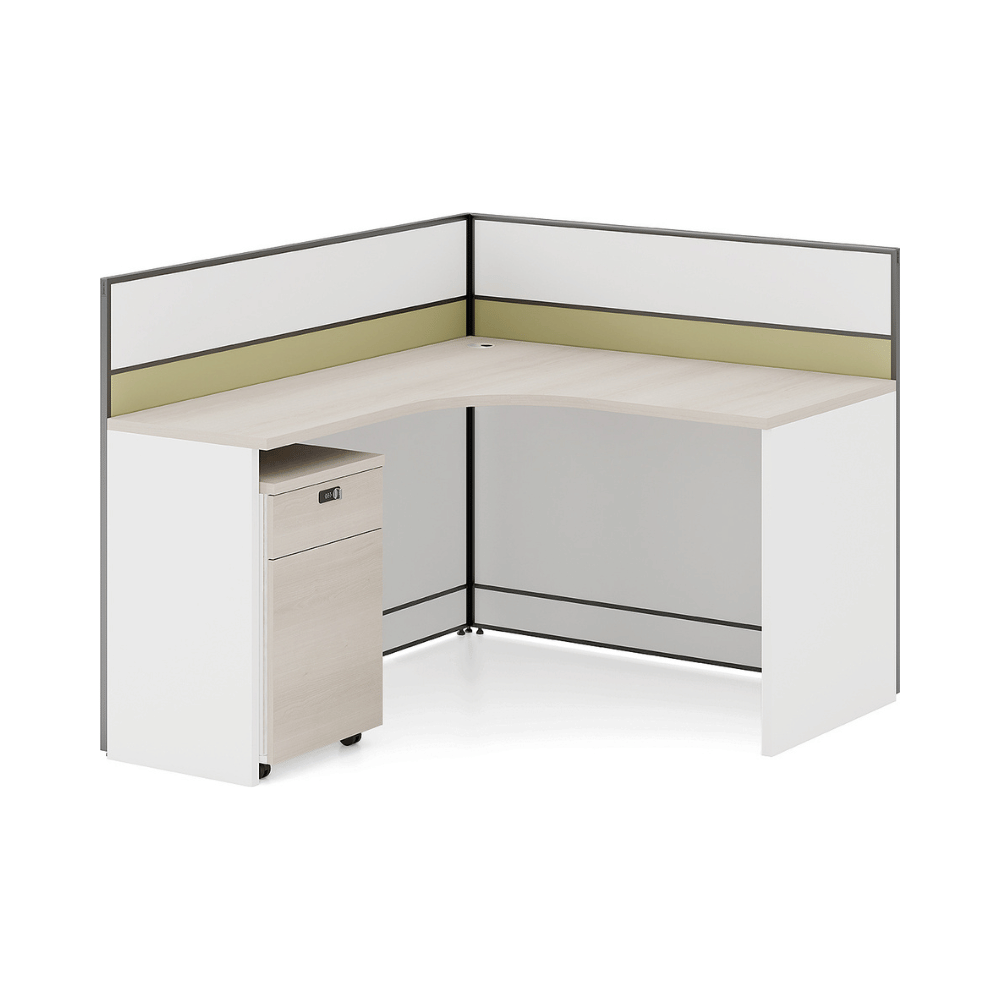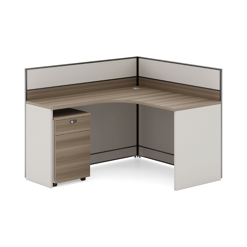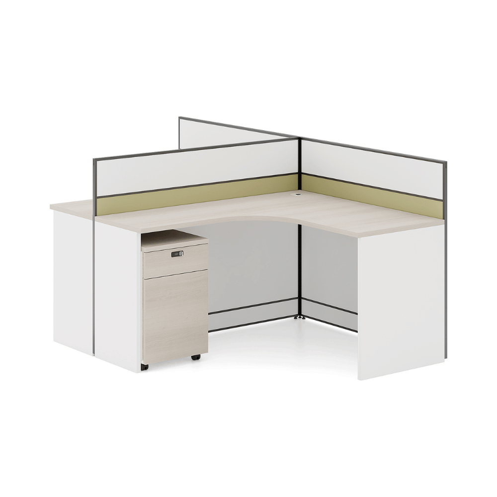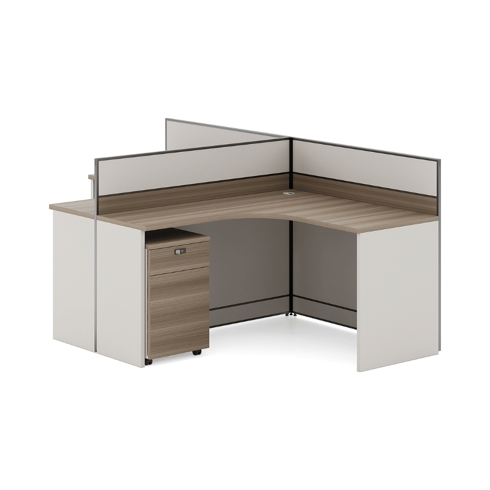 Le bureau est constitué d’un plateau en bois de 25 mm d’épaisseur, offrant une surface robuste et durable. La finition en placage importé d’Allemagne assure une esthétique soignée et professionnelle. Les panneaux de séparation sont disponibles dans une variété de couleurs personnalisables, permettant une intégration harmonieuse dans différents décors.